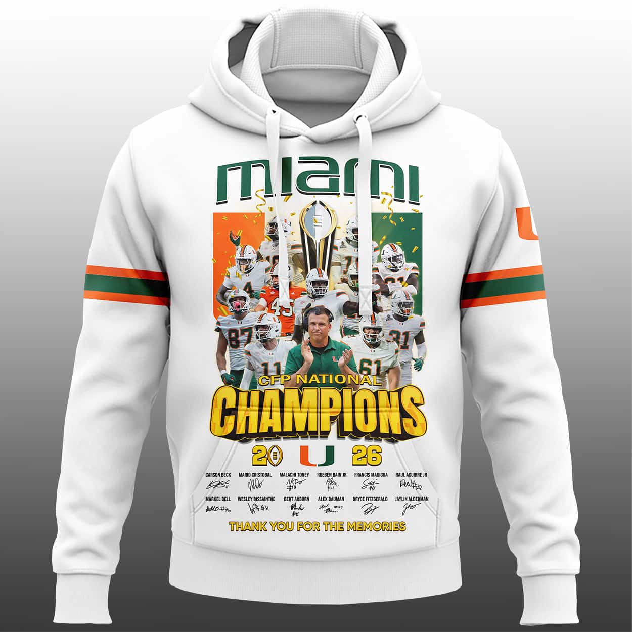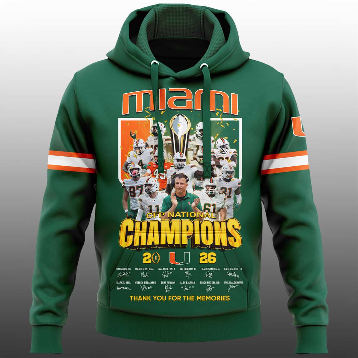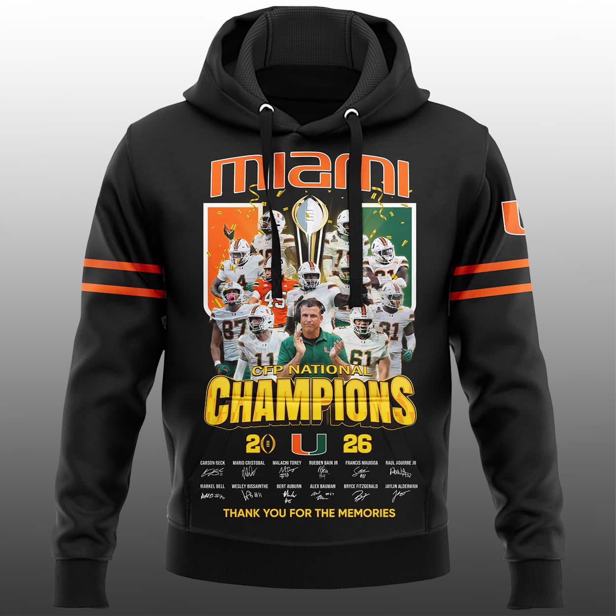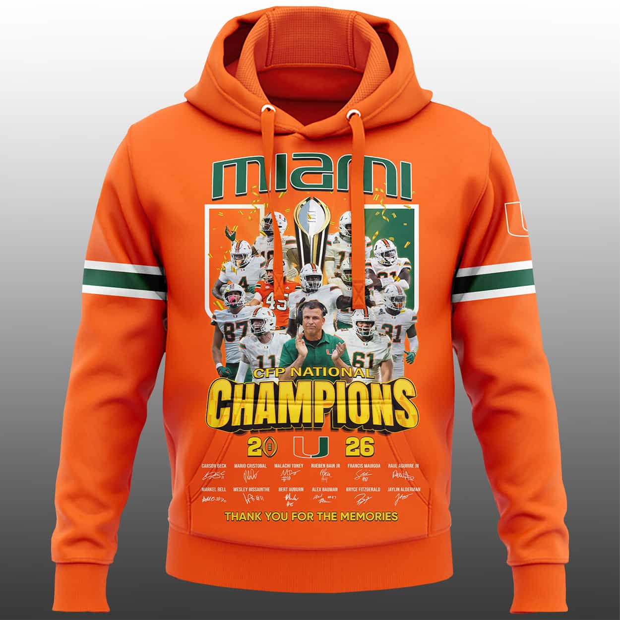 Turn heads and relive the glory with this hoodie. Drenched in bold orange, this hoodie is a visual touchdown. The front explodes with “miami” in stylized green and orange lettering, followed by a high-energy collage of football players mid-action and a gleaming championship trophy front and center. Below it all, “NATIONAL CHAMPIONS” beams in bold yellow, while the year—“2026”—flanks the University of Miami logo like a badge of honor. The sleeves sport green and white stripes, with the left sleeve proudly displaying the UM logo. At the bottom, a timeline of championship years and the heartfelt phrase “THANK YOU FOR THE MEMORIES” seals the legacy.