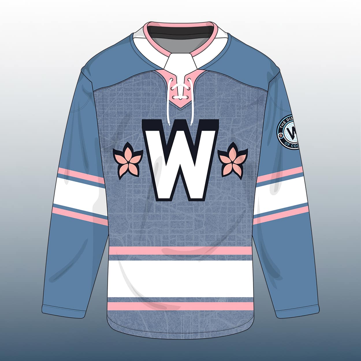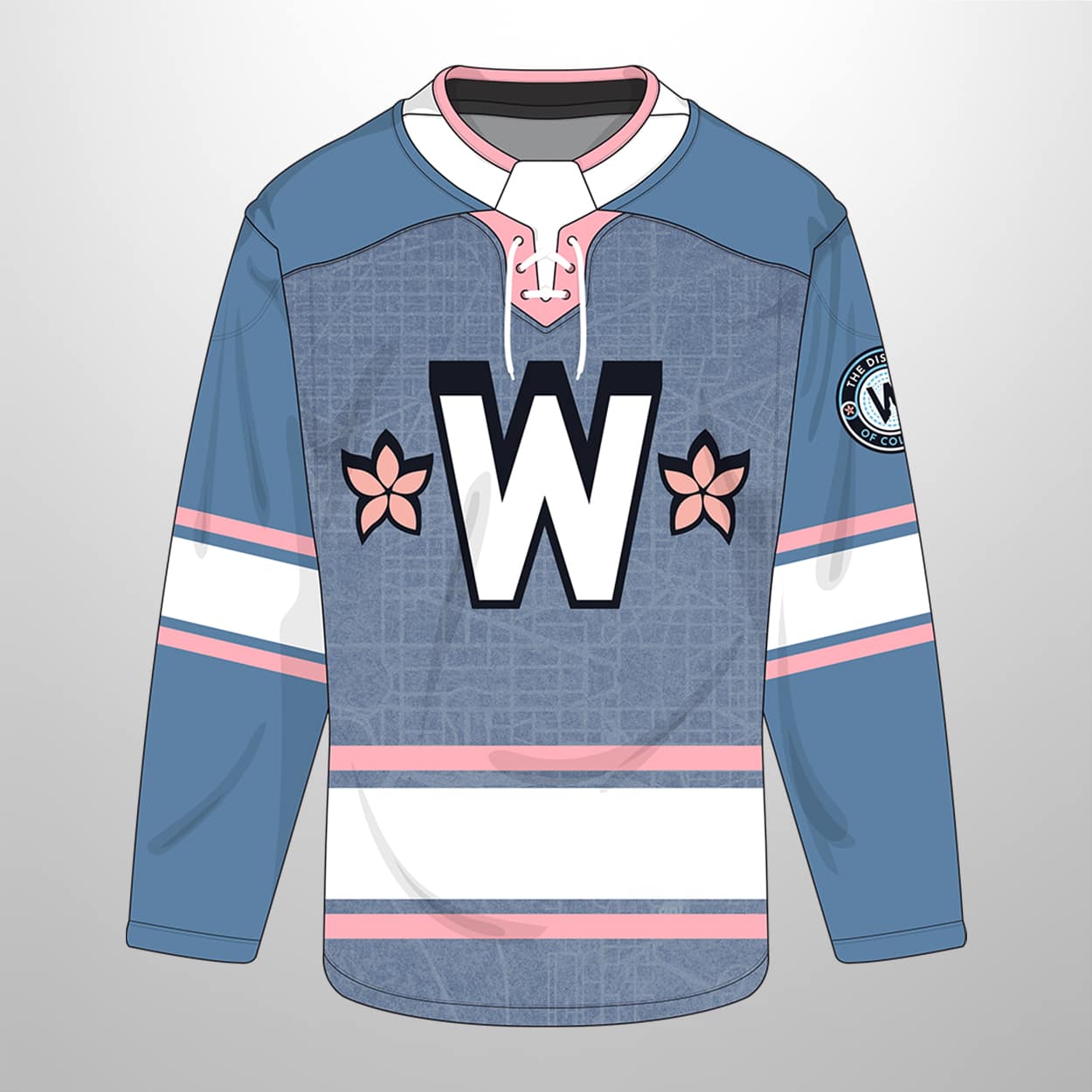 This jersey is a dazzling tribute to Washington, D.C.’s springtime charm and sports legacy. This sleek blue jersey features crisp white and pink accents, with horizontal stripes on the sleeves and hem that add a classic hockey vibe. Front and center, a bold white “W” outlined in black anchors the design, flanked by two vibrant cherry blossom flowers—an unmistakable nod to the city’s iconic bloom. A lace-up collar with pink trim adds a vintage twist, while the circular “W” patch on the sleeve seals the deal with team pride.