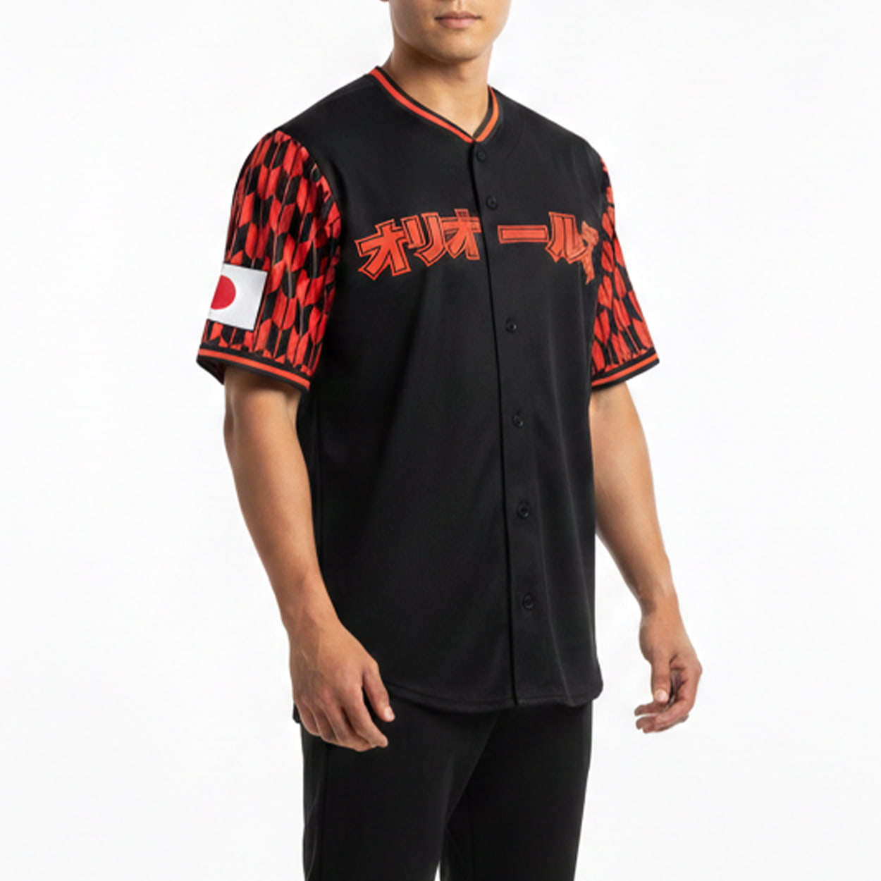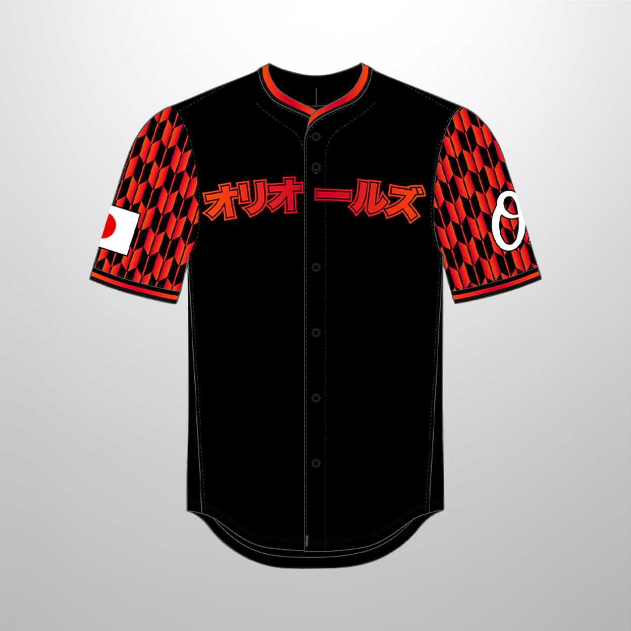 Get ready to turn heads at Camden Yards with this jersey—an item that blends cultural flair with baseball swagger. This sleek black jersey is accented with fiery red and orange tones, featuring a bold chest graphic in Japanese characters that reads “オリオールズ” (Orioles). The sleeves steal the show with a red-and-black checkered pattern that adds a punch of visual rhythm. On the left sleeve, a Japanese flag patch pays homage to heritage, while the right sleeve sports a crisp white circular logo for balance and contrast. It’s a jersey that doesn’t whisper—it shouts style.
