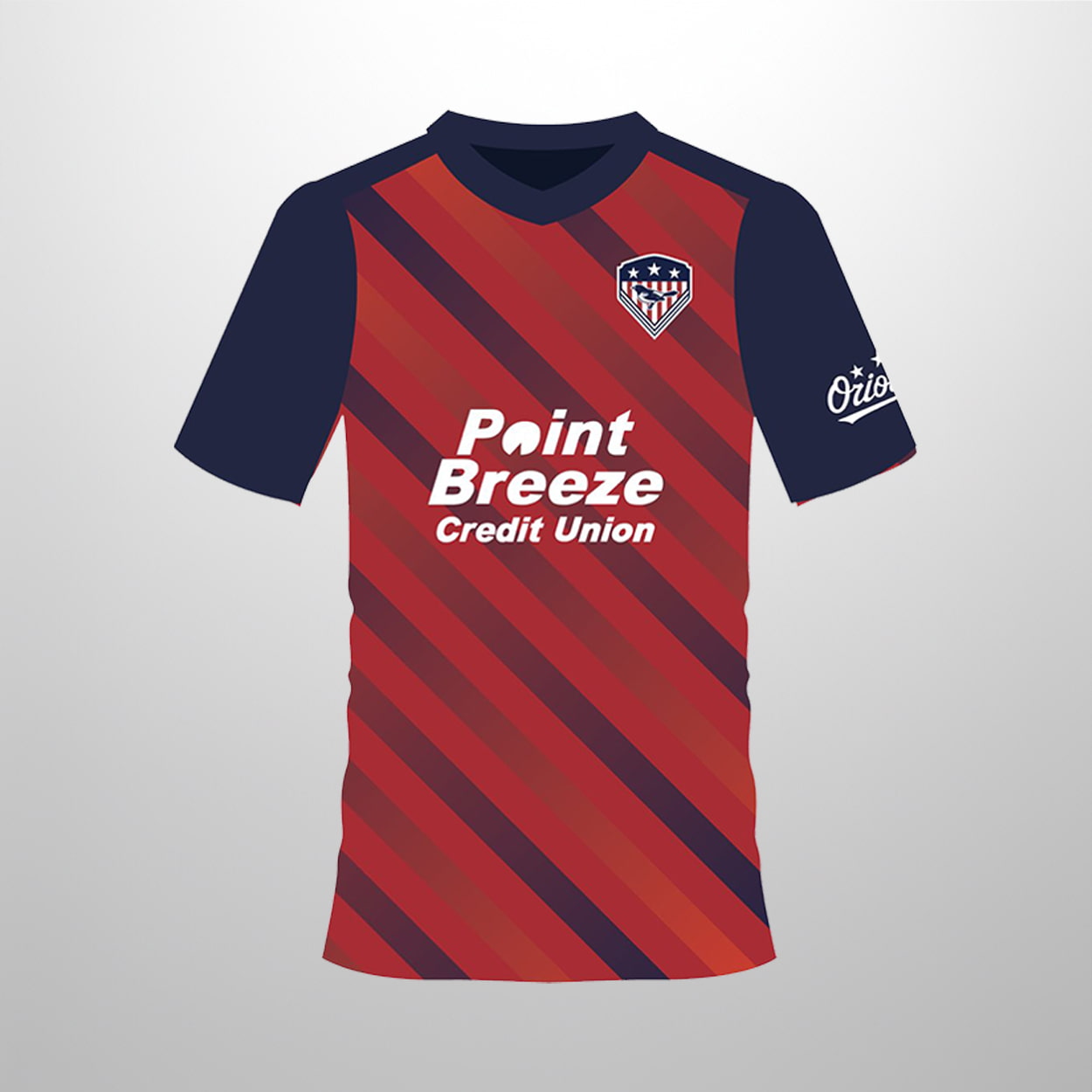 Get ready to turn heads on and off the pitch with this jersey, a dazzling fusion of athletic flair and hometown pride. This jersey features a fiery red base sliced with sleek diagonal navy stripes, giving it a dynamic, in-motion feel. The shoulders and sleeves pop in solid navy, adding contrast and confidence. Front and center, “Point Breeze Credit Union” stands out in crisp white—with its stylized bird—adds a touch of fierce charm. Flip it around and you’ll find “BIRDLAND” soaring across the upper back in proud white caps, with the FCB heart perched above like a badge of honor.