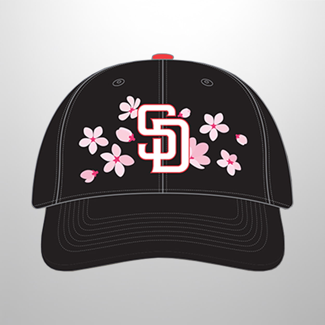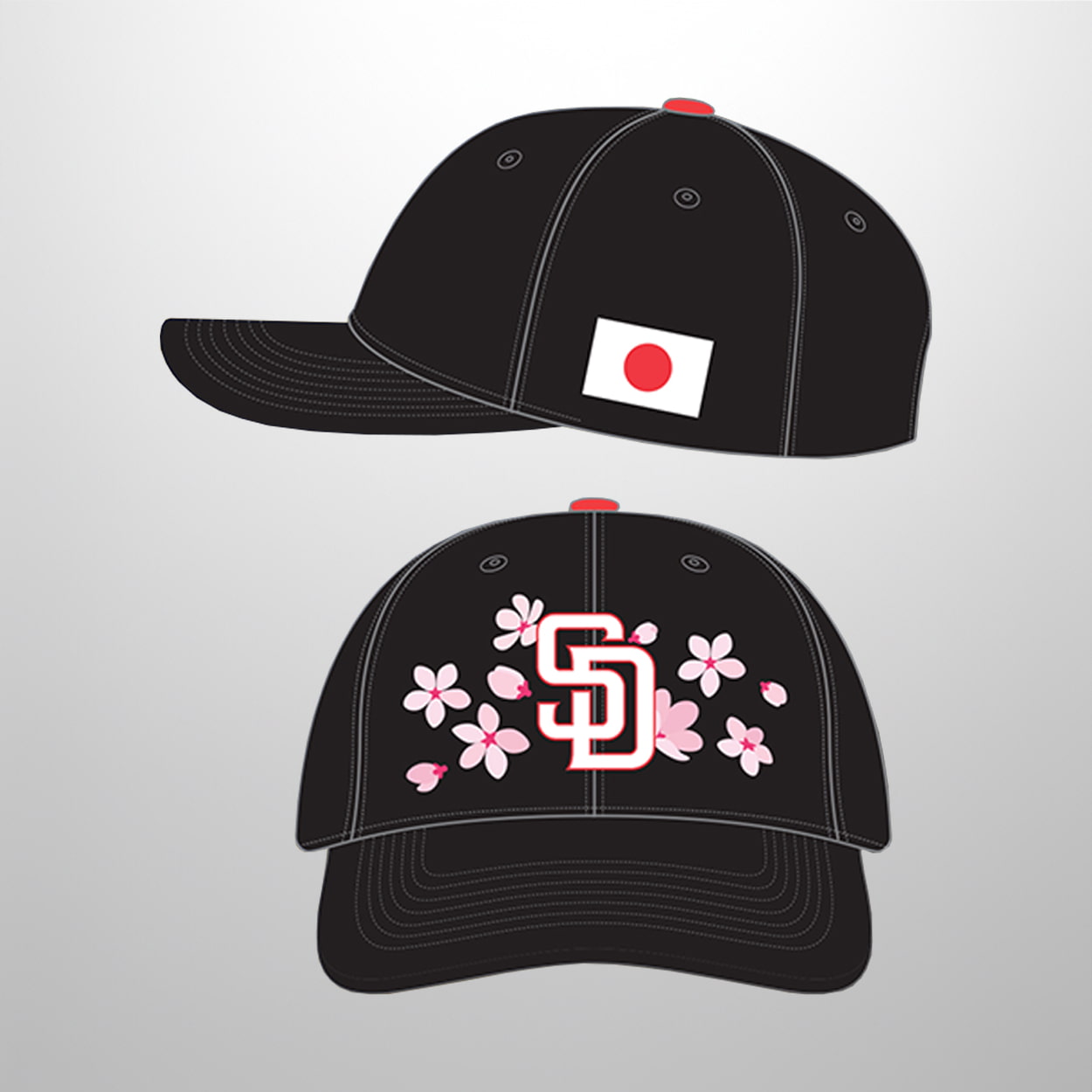 This hat is a visual home run. With a sleek black base and crisp white stitching, this cap commands attention from every angle. The front features the classic “SD” logo outlined in red, surrounded by delicate pink cherry blossoms—an elegant nod to Japanese aesthetics. On the side, the Japanese flag adds a bold splash of national pride, while a red button tops it all off like the final pitch in a perfect game. It’s a cap that blends team loyalty with cultural celebration in one unforgettable design.