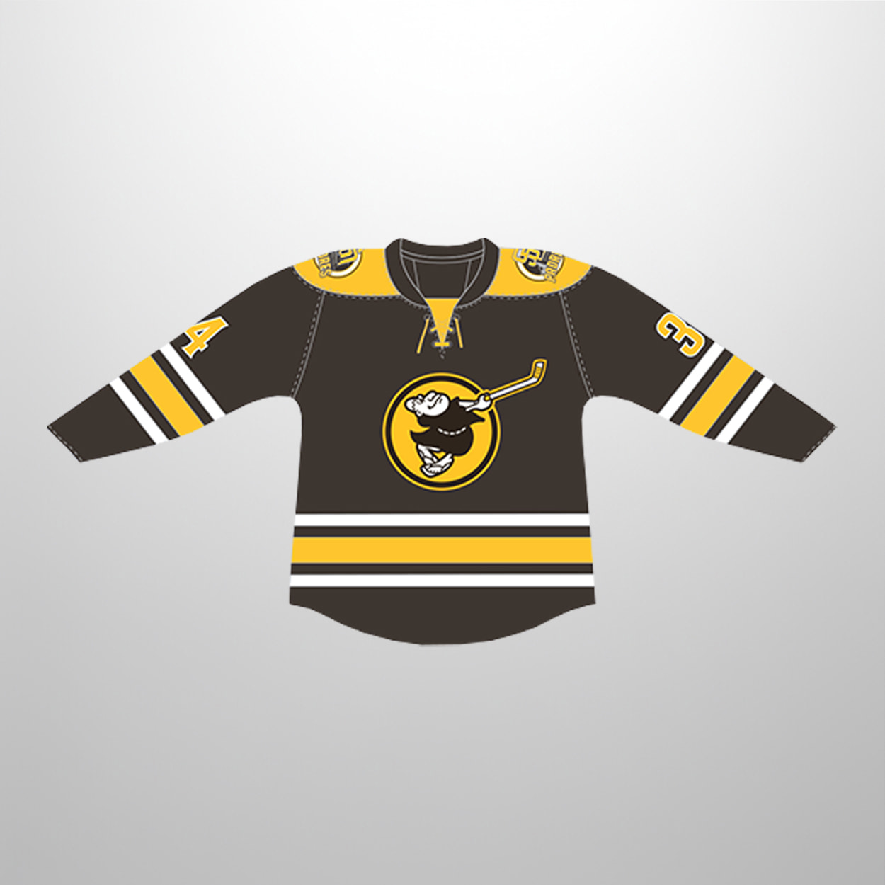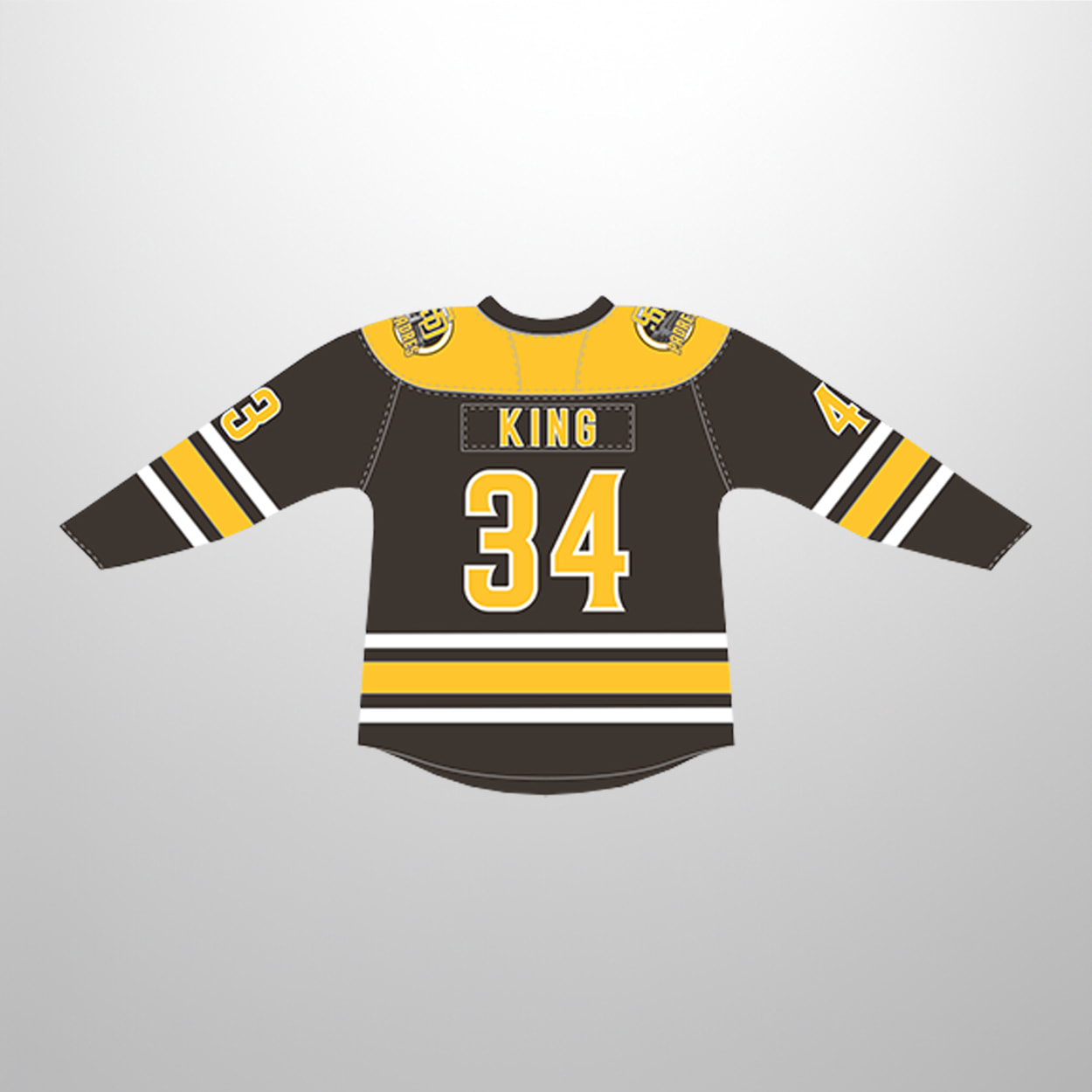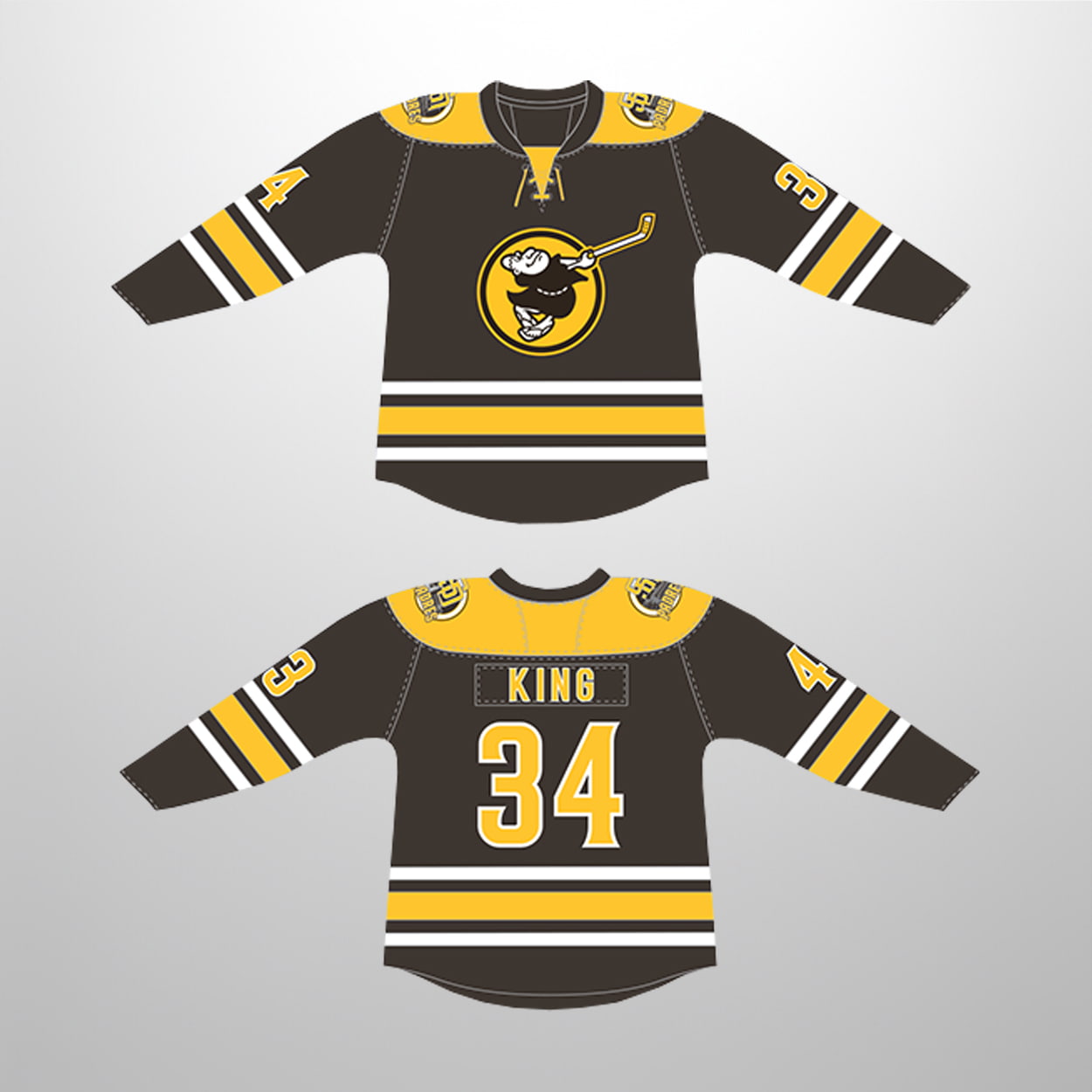 Get ready to break the ice with this jersey—an item that’s as fierce as it is fresh. This dark brown jersey is packed with personality, featuring bold yellow and white stripes across the sleeves and hem. The front showcases a circular logo of a stylized bee wielding a hockey stick, buzzing with attitude and team spirit. On the shoulders, the number “34” pops in crisp white against yellow patches, while the back proudly displays “KING” above a large yellow “34” outlined in white. It’s a jersey that commands attention from every angle.