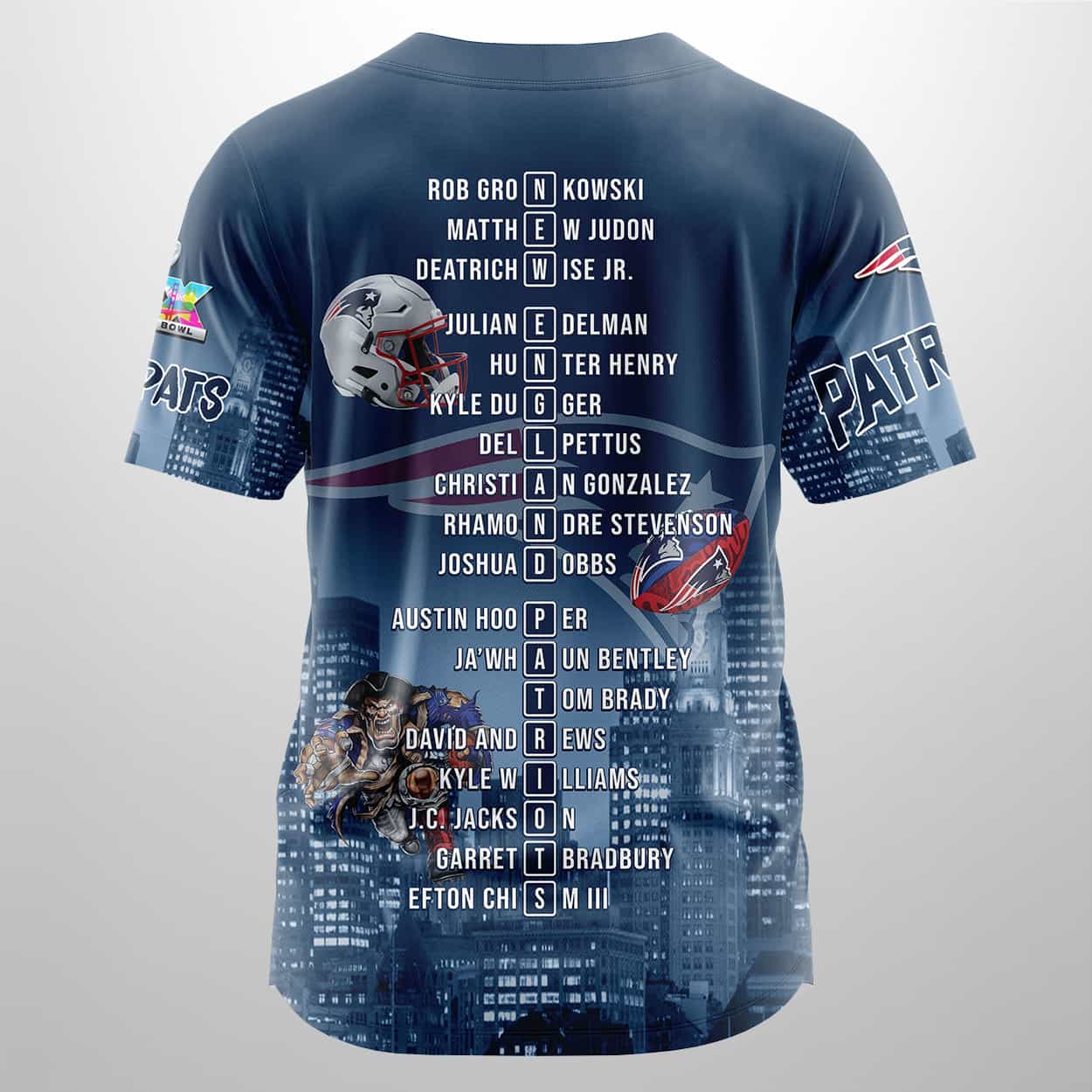 This isn’t just a jersey — it’s a celebration printed into every inch. The front bursts with energy: “CHAMPIONS” gleams in gold across the chest, with “PATRIOTS” proudly anchored below. A dynamic football graphic and the iconic Patriots logo sit center stage, surrounded by a star-spangled collage of red, white, and blue. Flip it around and you’ll find a roll call of heroes — from Kam Irvin to Tony Jones — each name paired with their jersey number, immortalized in bold print. And just to make sure the masterminds get their due. It’s a wearable roster of greatness.