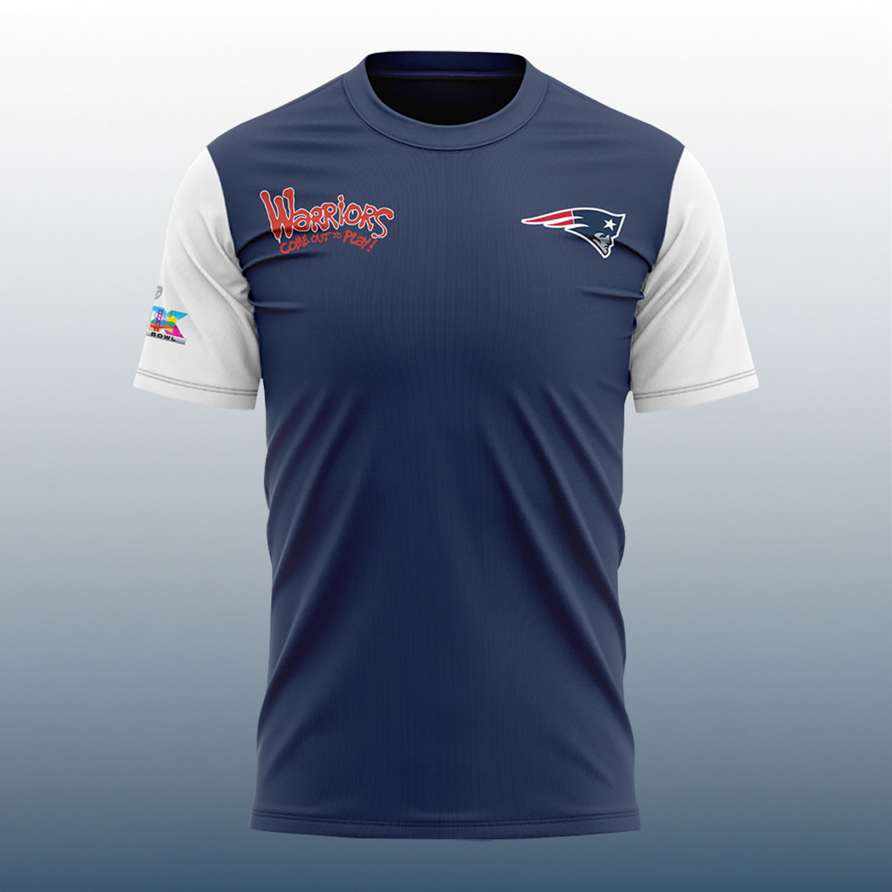 This shirt is more than just fan apparel—it’s a statement of triumph. With a navy blue body and crisp white sleeves, the shirt’s front proudly displays “Warriors” in striking red and white text, paired with a fierce skull logo that radiates fearless energy. To the right, the iconic Patriots logo stands tall, symbolizing championship glory. Flip to the back, and you’ll find a larger rendition of “The Warriors” graphic, crowned with the word “UNDEFEATED” beneath it—a bold reminder of the team’s unstoppable run.
