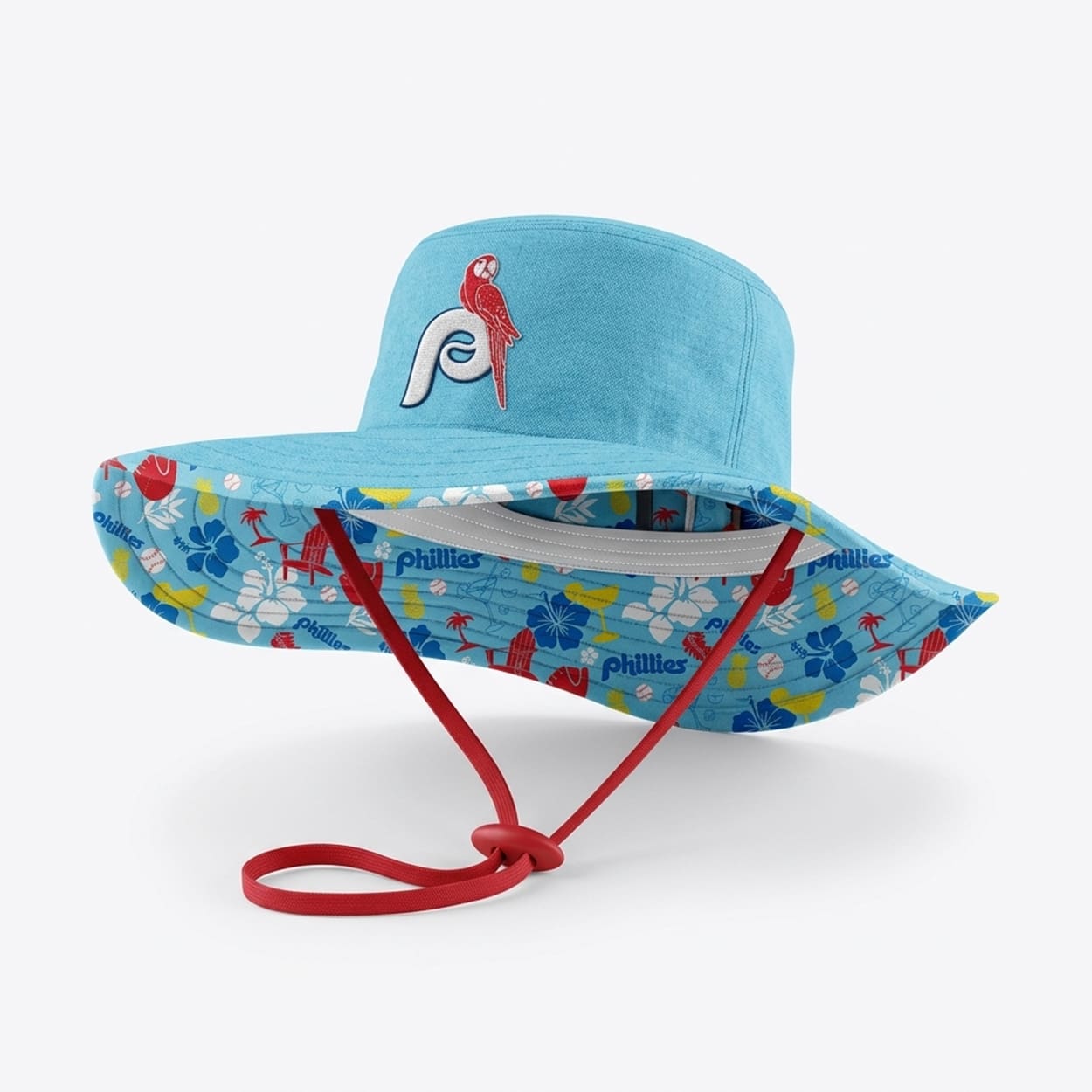 The design of this bucket hat is a playful tribute to the “Parrot Head” lifestyle, merging baseball tradition with island flair. The brim is where the party truly starts, showcasing a lively “island-hop” pattern. Peek under the brim or look closely at the trim to find a hidden oasis of imagery: tiny red Adirondack chairs, tropical hibiscus flowers, swaying palm trees, and refreshing cocktails mixed in with floating baseballs and the “Phillies” wordmark. It is a statement piece for the bold fan who thinks outside the diamond, proving that even the most dedicated “Phightins” fan knows how to find their five o’clock somewhere.