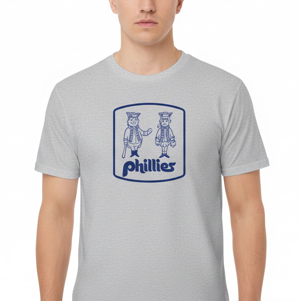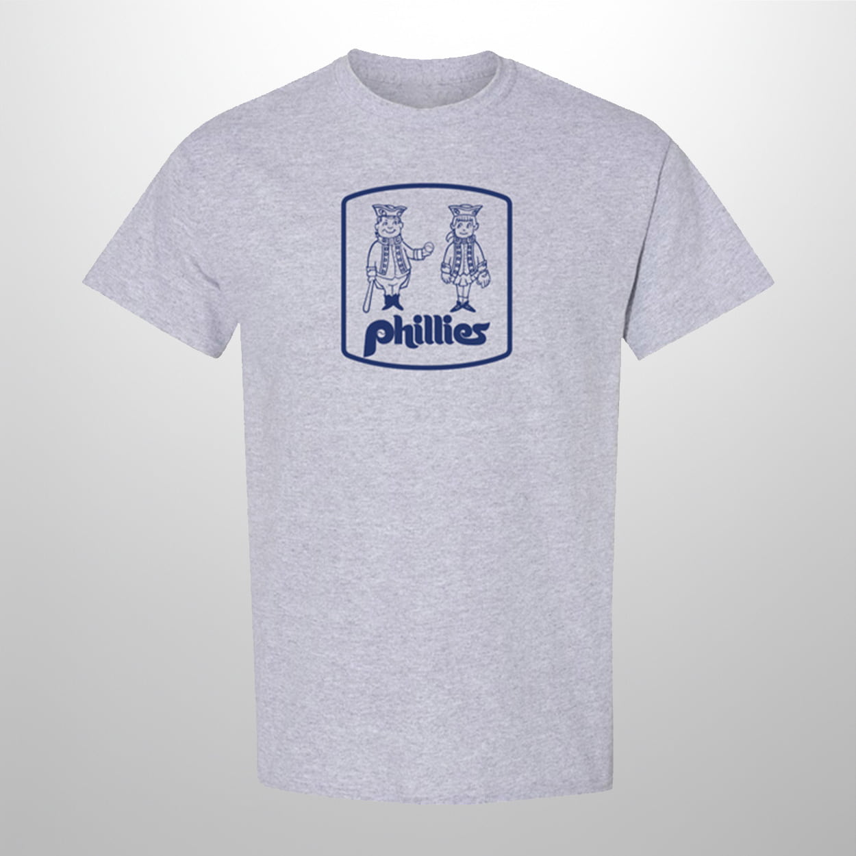 This shirt is a throwback celebration wrapped in modern flair. Its light gray base sets the perfect backdrop for a bold blue graphic featuring two cartoon-style ballplayers in vintage uniforms, standing side by side as if ready to take the field. Framed by a rectangular border above, the design feels both classic and fresh. Anchoring the look below, the word “phillies” appears in stylized lowercase letters, giving the shirt a playful yet unmistakably team-centric vibe.