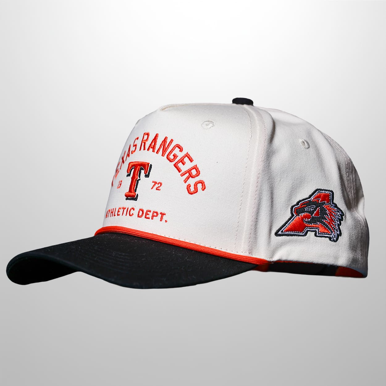 Step up to the plate with this cap, an item that perfectly blends professional baseball prestige with local powerhouse pride. This cap features a clean, cream-colored crown contrasted by a sharp black brim, anchored by a vibrant orange braided rope detail for that classic “coach’s hat” aesthetic. The front proudly displays “Texas Rangers Athletic Dept.” in a collegiate arch, flanking a stylized red “T” and the year 1972—a nod to the franchise’s deep roots. On the side, the iconic Aledo Bearcats logo is meticulously embroidered, making this more than just headwear; it’s a badge of honor for the community.