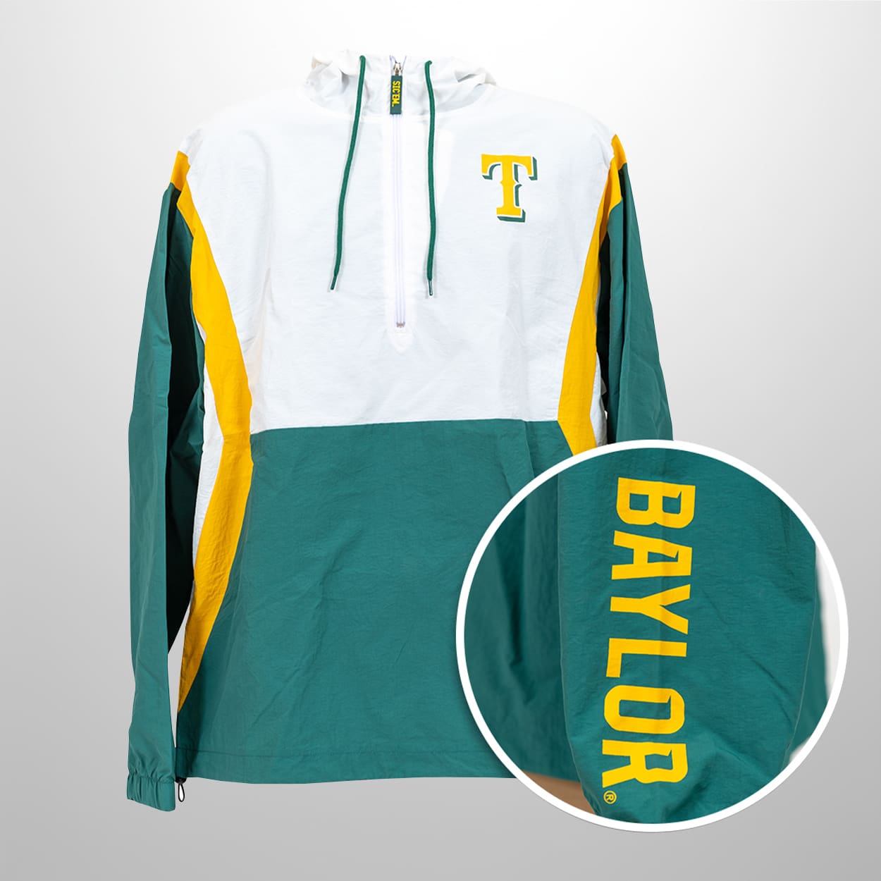 Get ready to cheer in style with this windbreaker. This jacket features a vibrant color-block design that blends green, white, and yellow for a fresh, energetic look. The top section shines in crisp white, paired with a green hood and drawstrings, while the lower half is a bold green. Yellow and green panels run down the sleeves, adding dynamic flair. On the chest, a striking “T” emblem pops in yellow and green, and the sleeve proudly displays “BAYLOR” in bold yellow letters running vertically—making sure your school pride is visible from every angle.
