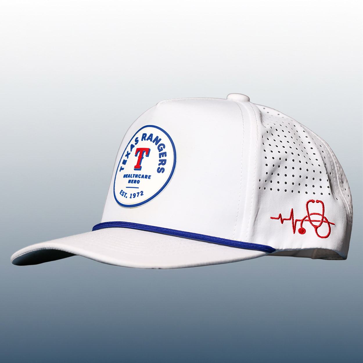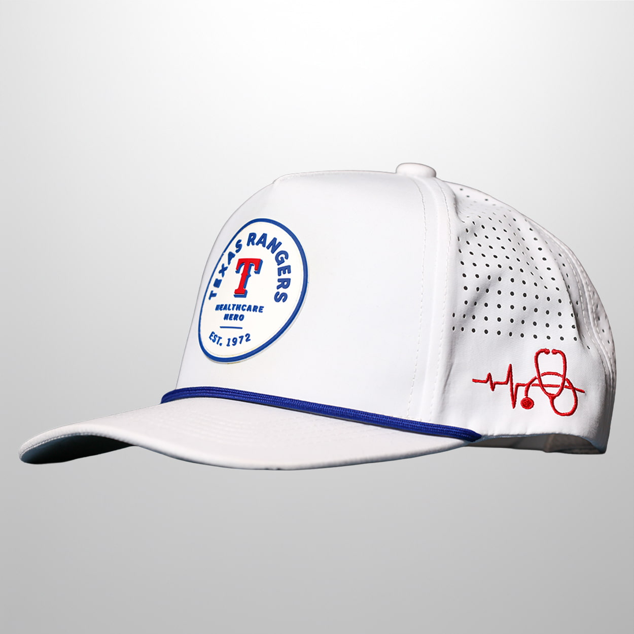 This cap is a crisp, clean tribute to those who keep our community healthy and safe. The design features a stark white crown and brim, accented by a classic royal blue rope running across the base of the crown. The focal point is a circular “Healthcare Hero” seal on the front, which proudly displays the red Rangers “T” and the team’s “Est. 1972” heritage. On the side, a vibrant red EKG heartbeat line pulses across the panel, playfully transforming into a stethoscope. For a modern touch, the side and back panels feature a sleek perforated pattern, adding both style and a breathable look to the silhouette.
