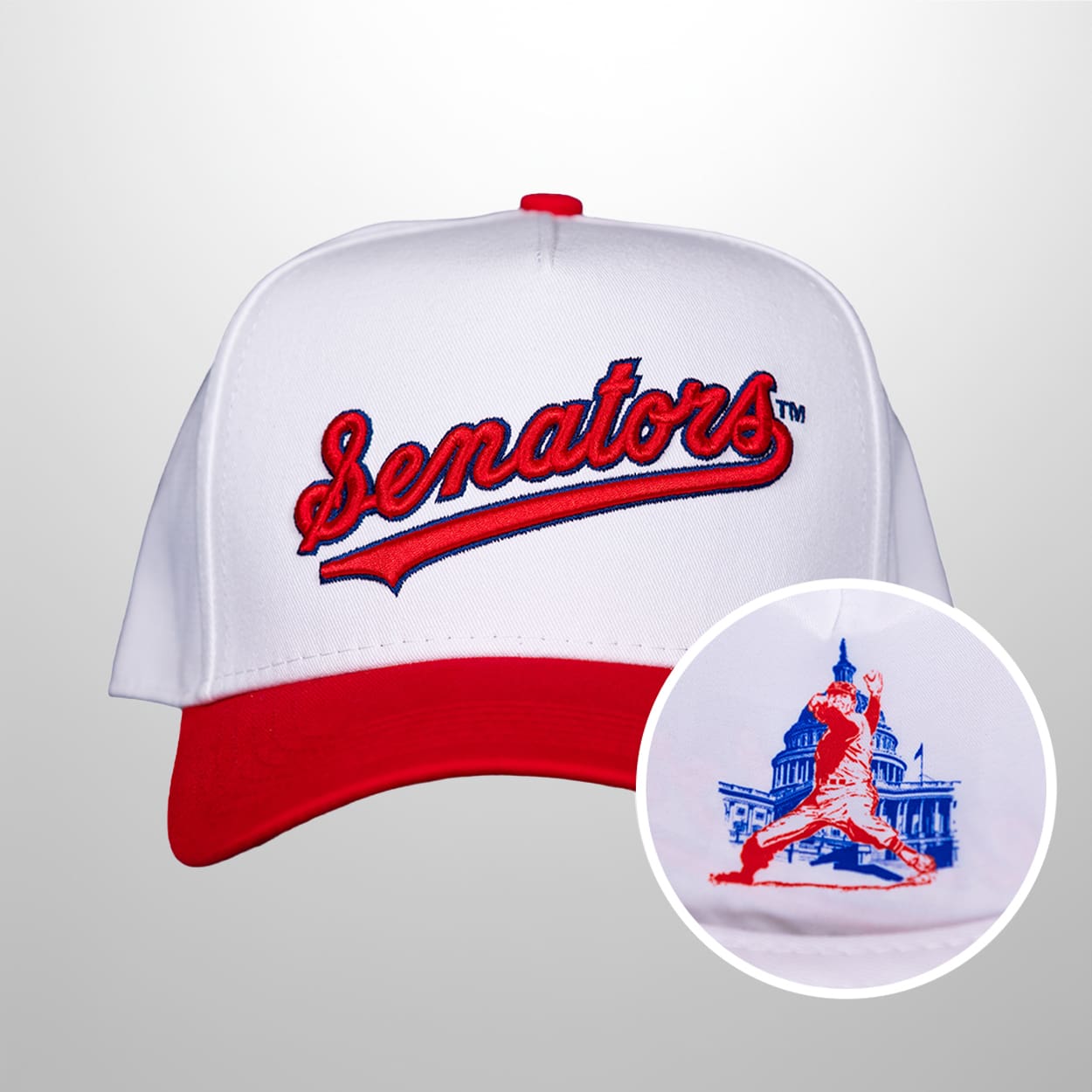 This isn’t just a cap—it’s a piece of baseball storytelling. The crisp white crown is accented with a striking red brim and top button, giving it a classic yet vibrant look. Front and center, the word “Senator” is embroidered in bold red script outlined in blue, instantly catching the eye. On the side, a baseball player mid-swing in red, set against the iconic silhouette of the U.S. Capitol in blue. It’s a design that blends sport and symbolism, making this cap a standout giveaway for fans who love both the game and its heritage.