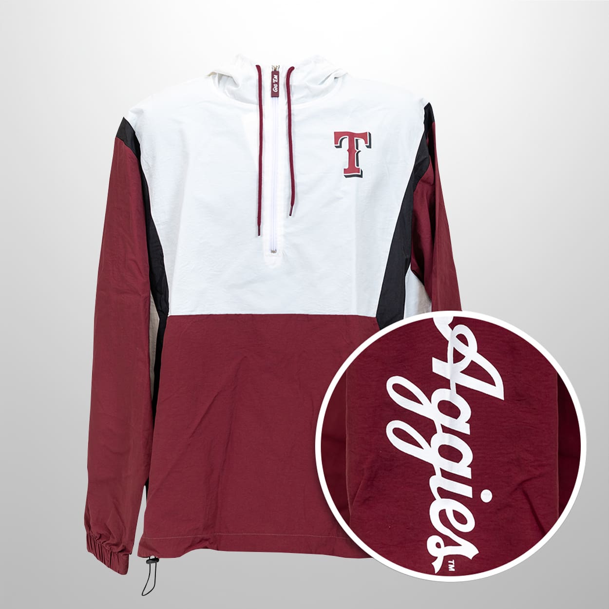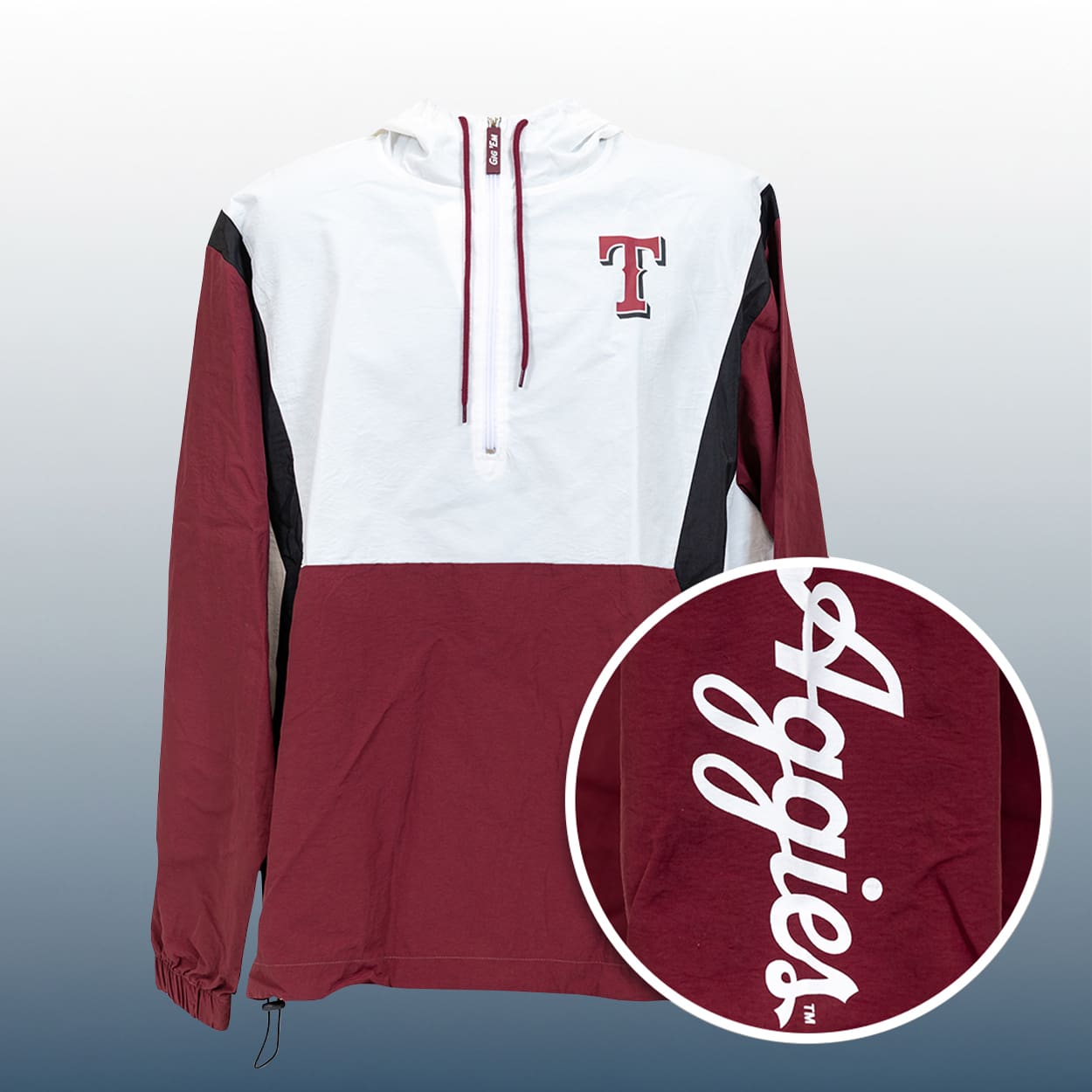 This isn’t just a windbreaker—it’s a statement. This windbreaker features a striking color-block design: a crisp white top half paired with a rich maroon bottom. Black accents run vertically along the chest, adding sharp contrast and athletic flair. On the left chest, a large embroidered “T” outlined in white proudly represents Texas A&M spirit. And for those who love the finer details, a close-up reveals “Aggies” stitched in elegant white cursive across the maroon fabric, a subtle nod to tradition that fans will instantly recognize.