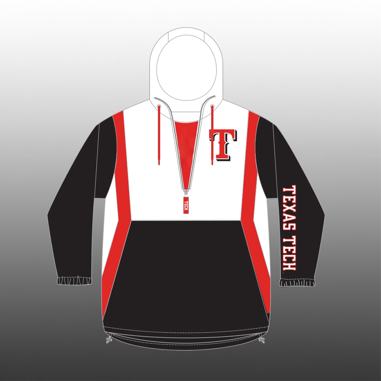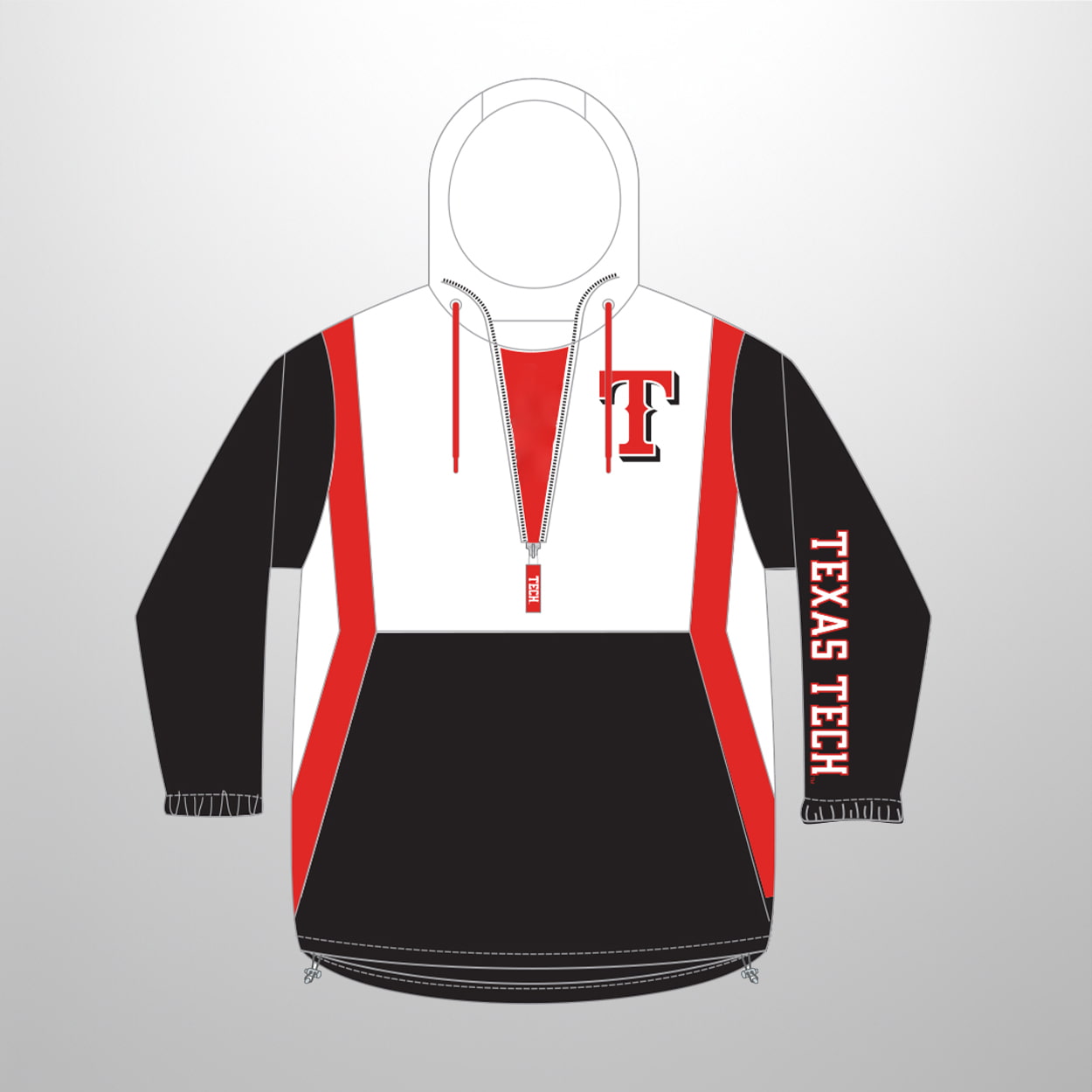 Step into the spotlight with this windbreaker. This pullover hoodie-style jacket features a striking color scheme of black, white, and red that instantly commands attention. The top portion shines in crisp white, accented by a bold red zipper and drawstrings, while the lower half transitions into sleek black. Diagonal red and white stripes add dynamic movement along the sides, giving the design a sporty edge. On the chest, a stylized “T” logo in red and black makes a powerful statement, while the right sleeve proudly displays “TEXAS TECH” in bold white letters against a vibrant red background.