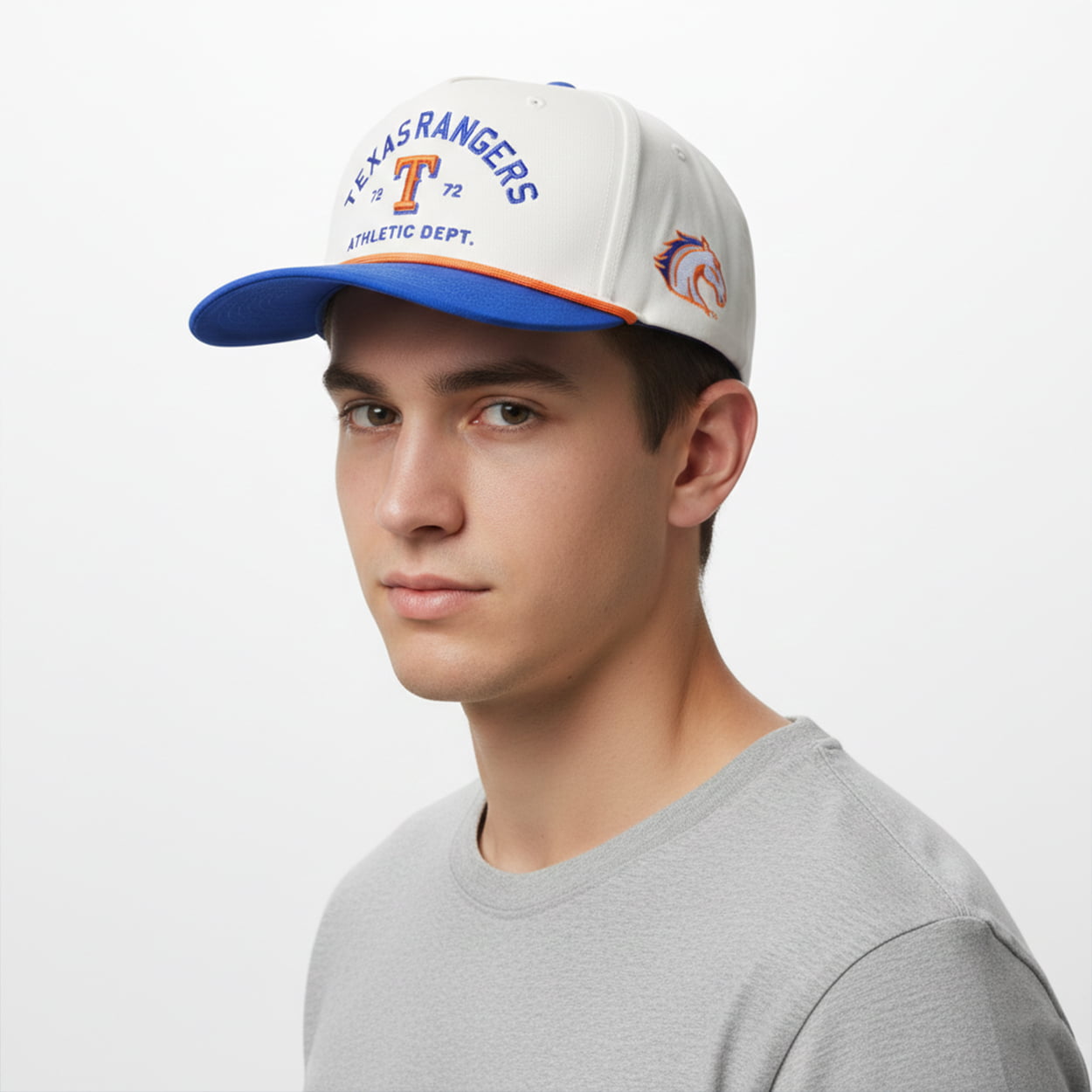Step into the spotlight with this cap. This white and blue cap features striking embroidered details: “TEXAS RANGERS” proudly across the crown, a bold orange-and-blue “T” front and center, and the number “1972” paired with “ATHLETIC DEPT.” for a vintage collegiate vibe. The side showcases a fierce horse head logo in orange and blue, while the brim adds a playful twist with a blue base and orange accent trim. It’s the perfect blend of sporty tradition and modern energy.