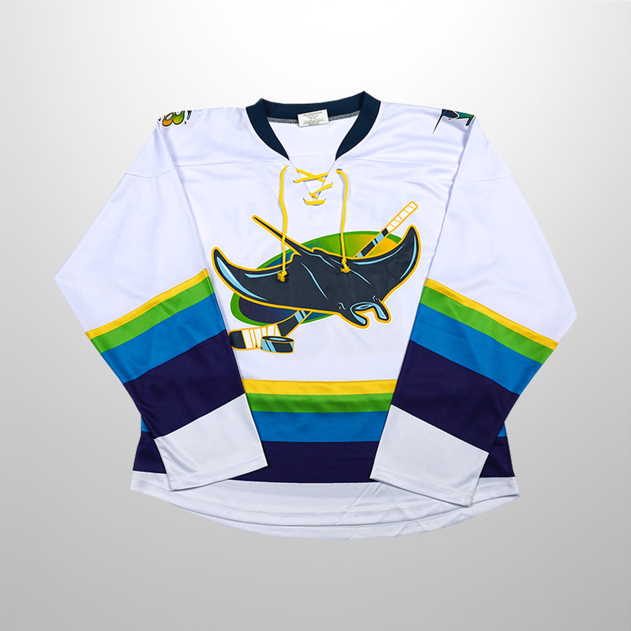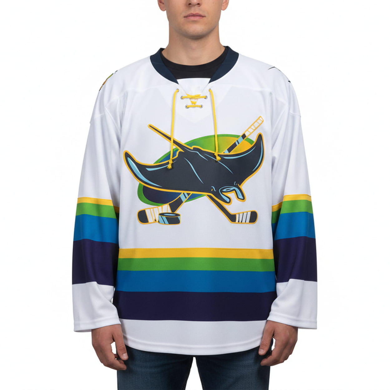 This jersey draws inspiration from the ocean’s most mysterious creature: the manta ray. Known for its grace and power, the ray embodies the fearless spirit of the Rays hockey team. The playful stripes echo the dynamic motion of waves, while the logo captures the thrill of competition. It’s not just apparel—it’s a wearable piece of art for fans who embrace boldness and individuality.
