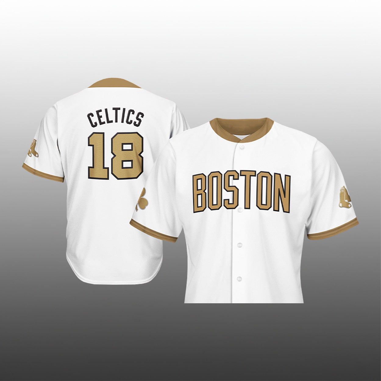 This jersey is a slam-dunk of style and spirit. This crisp white baseball-style jersey is decked out with bold gold and black accents that command attention. On the front, “BOSTON” shines in gold lettering outlined in black, while the back proudly reads “CELTICS” above the number “18”—a nod to championship dreams and hardwood glory. Gold shamrocks grace both sleeves, and a golden collar adds a regal touch. It’s a crossover masterpiece that blends the swagger of Fenway with the legacy of the Garden.