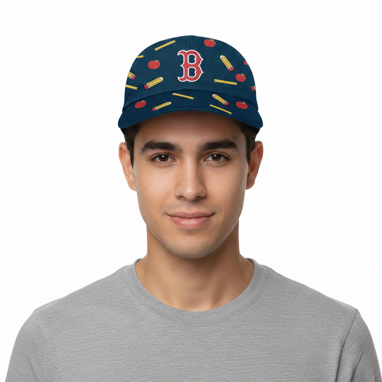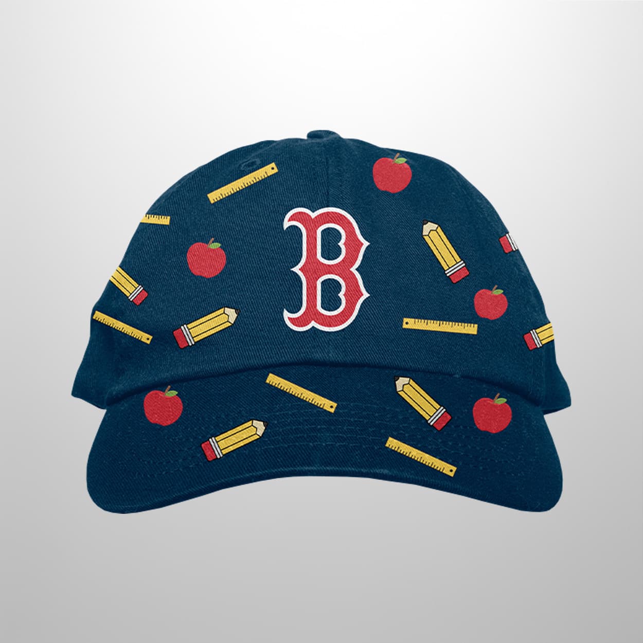 This hat is a home run for fans who know that teaching is a team sport. This dark blue cap features a bold red brim and a classic “B” logo front and center, outlined in white for extra pop. But the real charm lies in the playful pattern scattered across the crown—red apples, yellow pencils, and rulers that celebrate the tools of the trade. It’s a vibrant mix of school spirit and Sox swagger, perfect for educators who bring heart and hustle to every lesson.