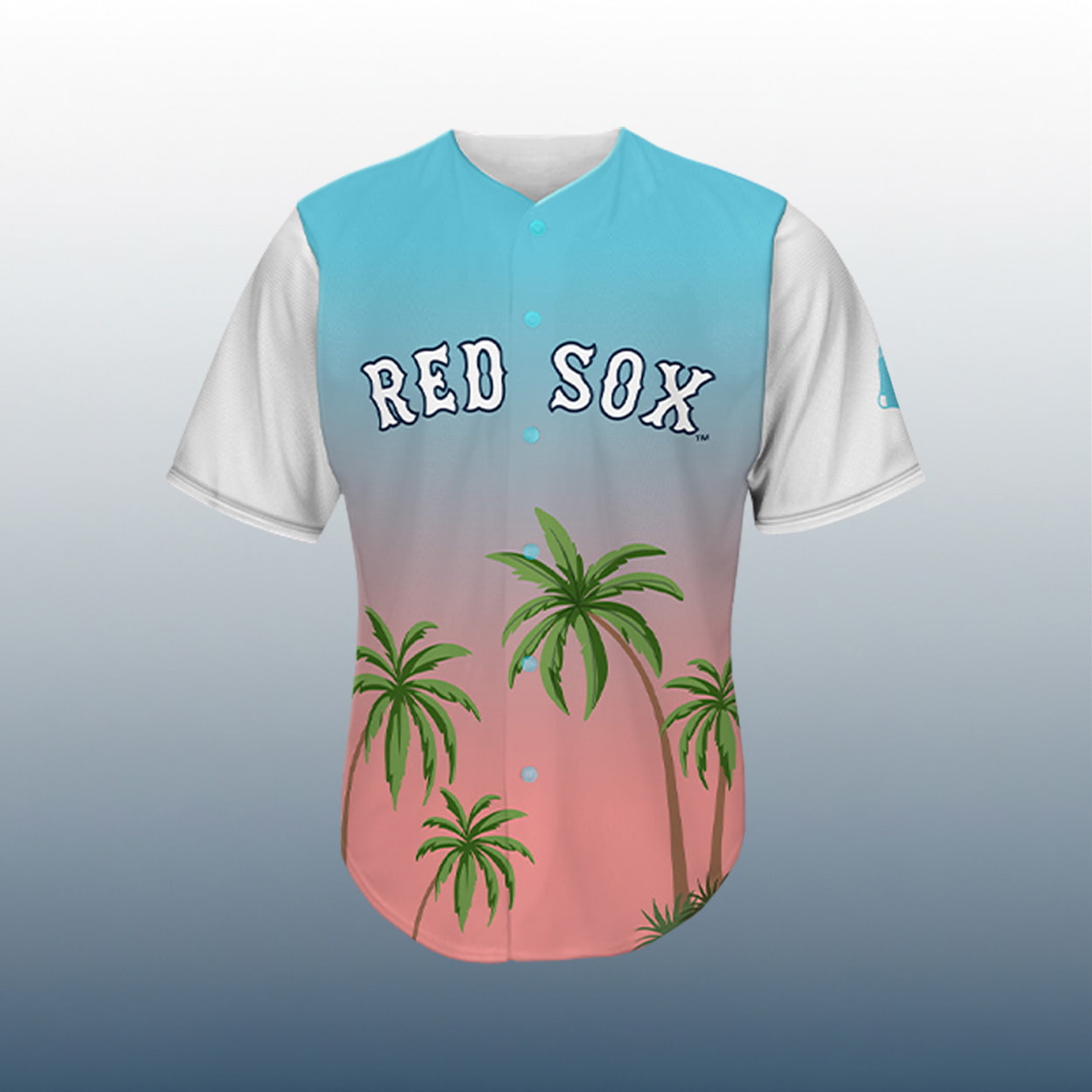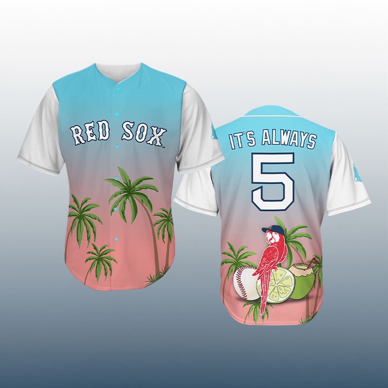 Get ready to turn heads at Fenway with this jersey—a dazzling fusion of baseball tradition and island flair. The front proudly displays “RED SOX” in crisp white block letters, set against a dreamy gradient of ocean blue, sunset pink, and peach tones. Towering green palm trees sway across the lower half, while clean white sleeves add a fresh contrast. Flip it around and you’ll find the phrase “IT’S ALWAYS” perched above a bold number “5,” outlined in cool blue. Below, a vibrant red parrot lounges on a sliced lime and coconut, surrounded by more tropical greenery. It’s not just a jersey—it’s a vacation in wearable form.