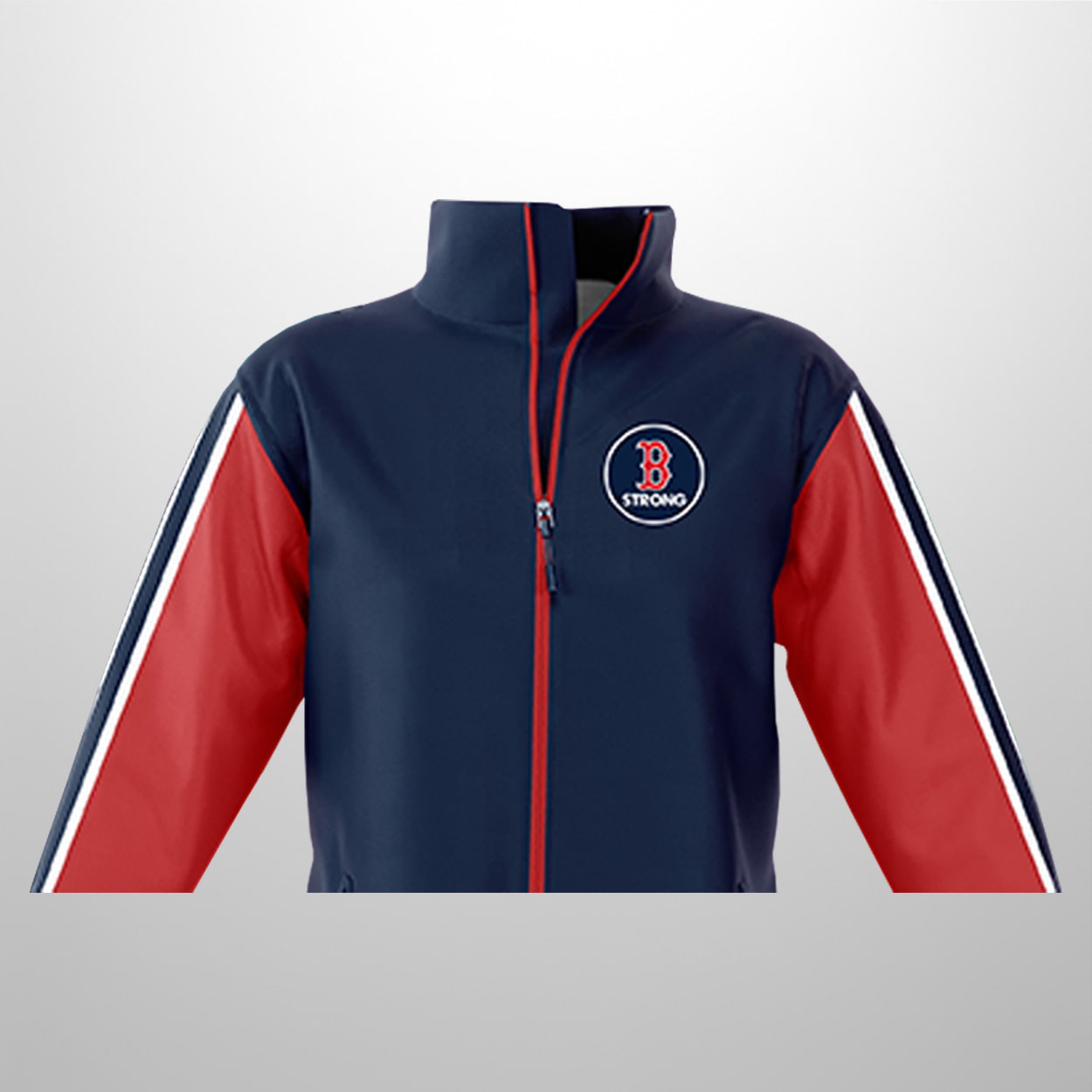 Step into the spirit of Patriots Day with this windbreaker—a sleek tribute to Boston’s grit and heart. This navy and red zip-up jacket features a high collar and bold sleeve stripes that scream classic ballpark energy. On the front, a circular emblem with the iconic red “B” sits proudly on the chest. Turn it around and you’ll find a larger version of the emblem with the word “STRONG” printed below in crisp white, a powerful nod to Boston’s enduring spirit. The red sleeves are accented with white and navy stripes, and a subtle sponsor logo adds a modern touch to the upper back.