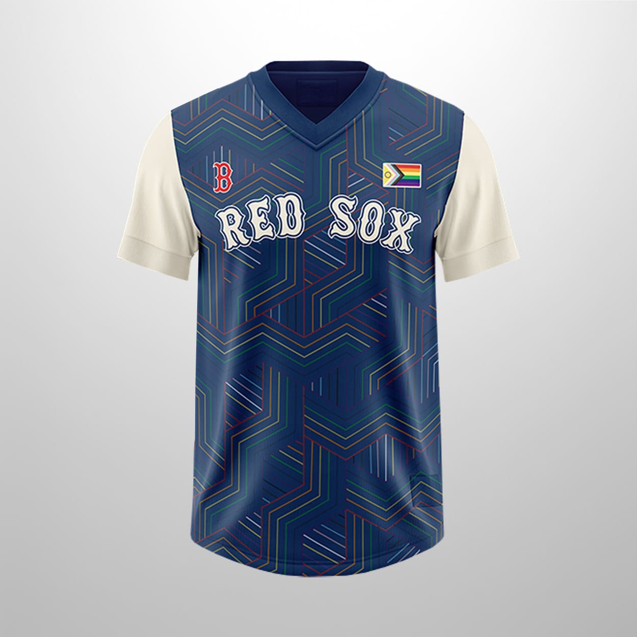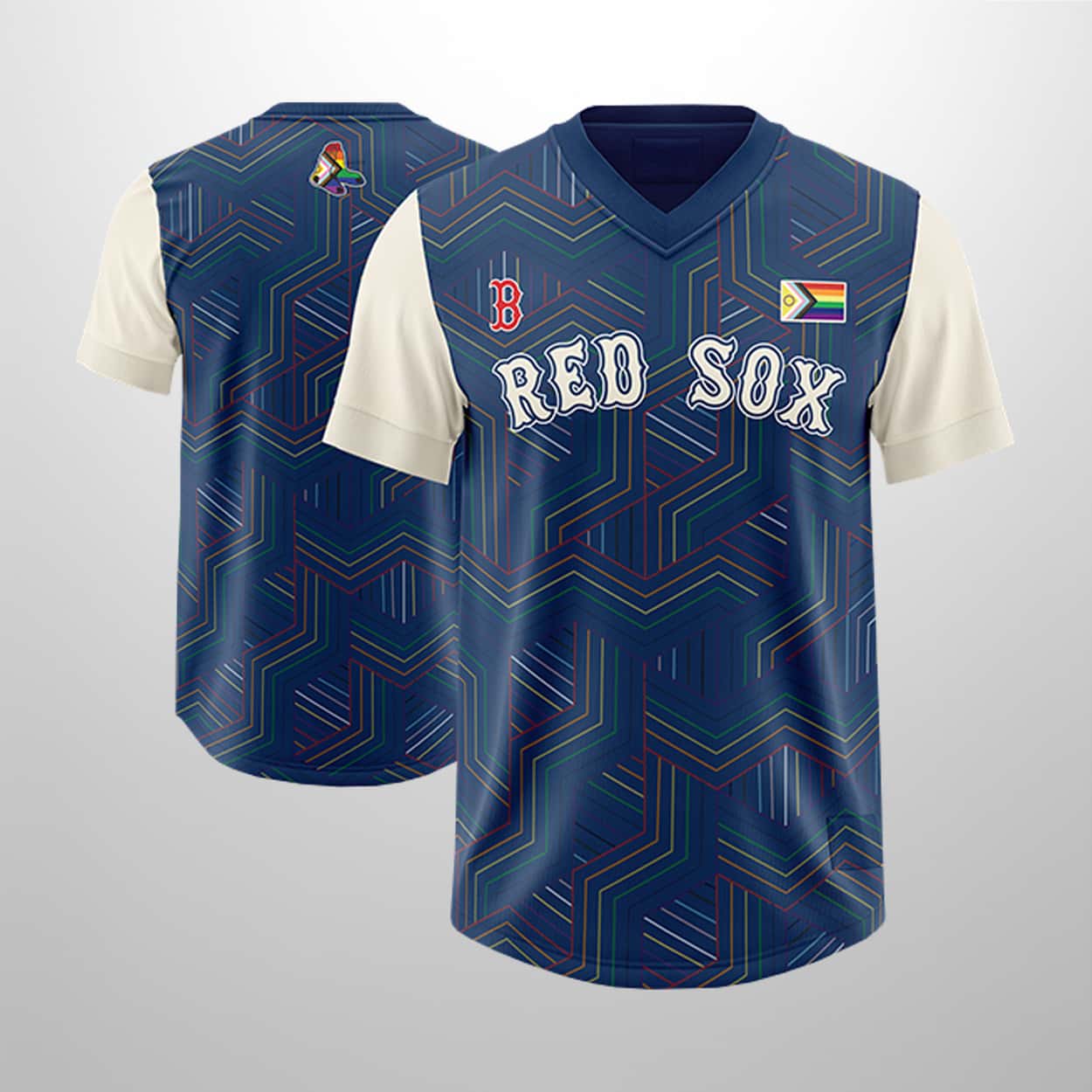 This jersey is a striking blend of tradition and celebration. The front proudly displays “RED SOX” in bold white block letters outlined in red, set against a deep blue geometric pattern. On the left chest sits the classic red “B” logo, while the right side shines with a rainbow flag accented by a triangle, symbolizing inclusivity and support for the LGBTQ+ community. On the back, near the neckline, another rainbow emblem adds a finishing touch, making this jersey a true standout piece.