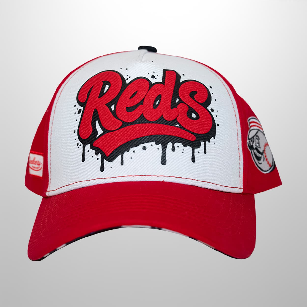 Step into the ballpark with confidence wearing this cap. This eye-catching cap features a striking red brim and side panels, contrasted by a crisp white front. The centerpiece is the word “Reds” splashed across the front in vibrant red lettering, outlined in black with a dripping paint effect that adds a rebellious, street-art vibe. On the side, a classic team patch showcases the iconic Reds character, tying modern flair to timeless tradition. It’s more than just a cap—it’s a statement of loyalty and pride.