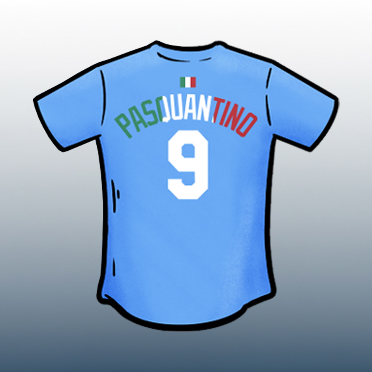 Show your love for Kansas City and Italian culture with this shirt. Set against a vibrant powder blue base, this tee features the classic “Royals” script across the chest, uniquely reimagined in the tricolore colors of the Italian flag: green, white, and red. The front is accented with player number 9 in bold red, while the back proudly displays “PASQUANTINO” arched over a large white number 9, topped with a miniature Italian flag icon.