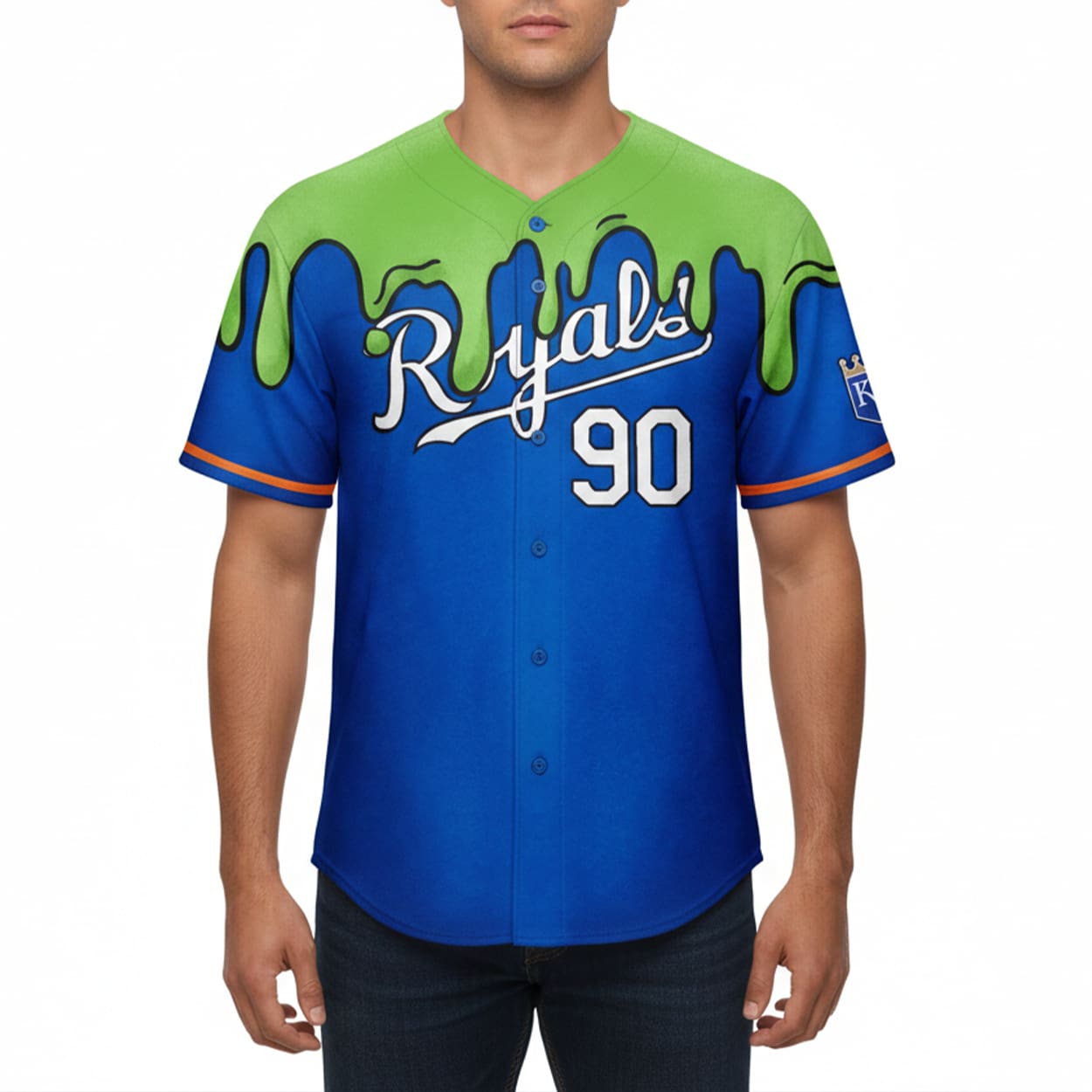 This jersey is a celebration of fun, fandom, and fearless style. Inspired by Nickelodeon’s iconic slime and the Royals’ legacy, it’s made for fans who embrace the unexpected. The dripping green goo isn’t just decoration—it’s a nod to the wild, wacky spirit of childhood and the joy of letting loose. Whether you’re a lifelong Royals supporter or just here for the slime, this jersey makes a bold statement: baseball is better when you play with personality.