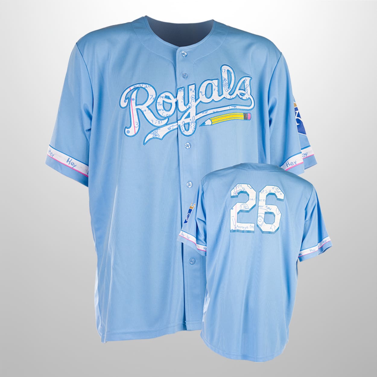 Step into the spotlight with this jersey—a fresh, fan-favorite giveaway that’s as smart as it is stylish. This light blue jersey features the iconic “Royals” script across the chest in crisp white, underlined by a golden swoosh that cleverly mimics a baseball bat. The button-down front and short sleeves are accented with white and blue stripes near the cuffs, giving it a polished, collegiate vibe. On the left sleeve, a bold “KC” patch stands proud, reminding everyone that Kansas City knows how to celebrate its MVPs—especially the ones in the classroom.