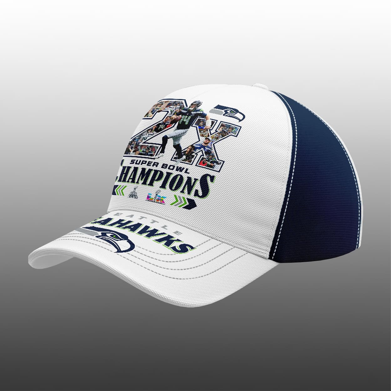 This cap is more than just headwear—it’s a victory crown. Featuring deep navy tones accented by vibrant Seahawks green, the cap proudly displays “2X SUPER BOWL CHAMPIONS” across the front in bold, stylized lettering. The Roman numerals are cleverly embedded with subtle graphics that nod to the game’s defining plays, while the brim showcases “SEATTLE SEAHAWKS” alongside the team’s iconic logo. Every angle of this cap tells the story of a franchise that soared to glory, defeating the Patriots in a championship clash for the ages.