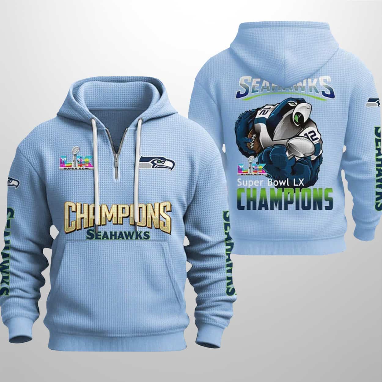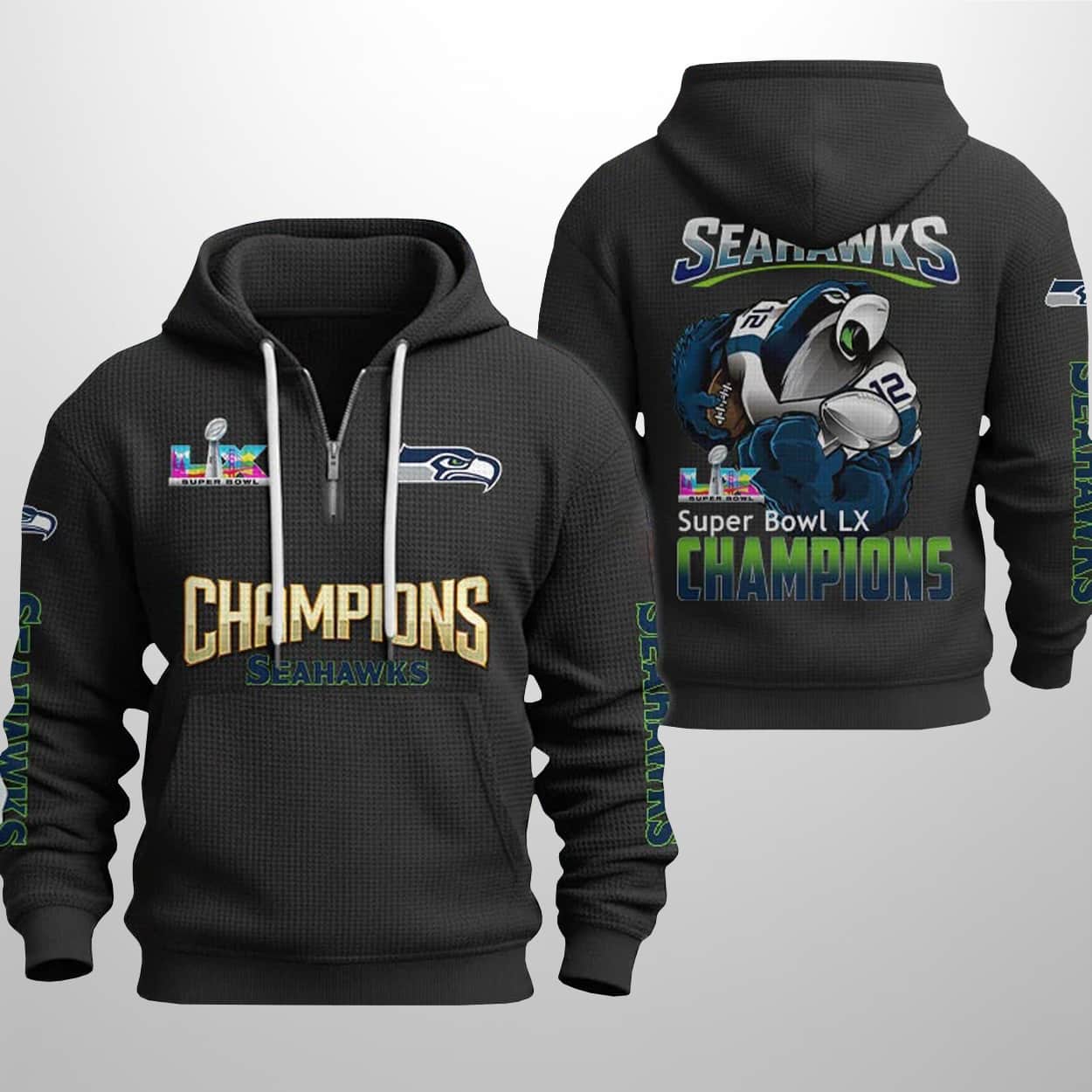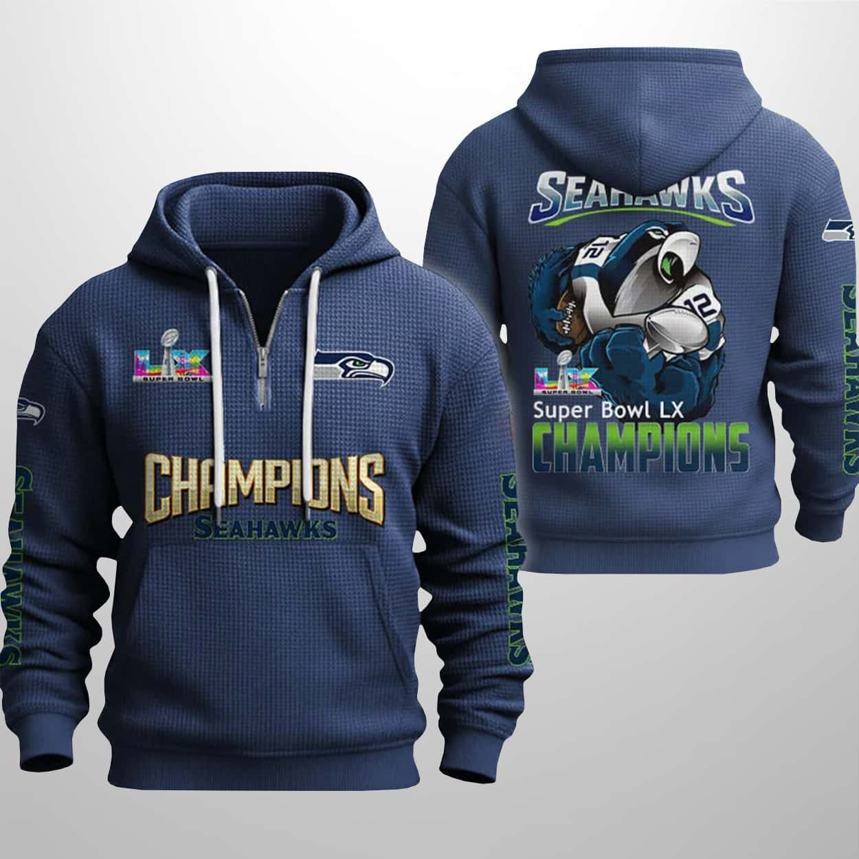 Ready to fly high with the champions? Don’t let this piece of history pass you by. Grab your 2026 Seahawks Bowl LX Champions Waffle Half Zip Hoodie today and keep the victory celebration alive all year long. Go Hawks!