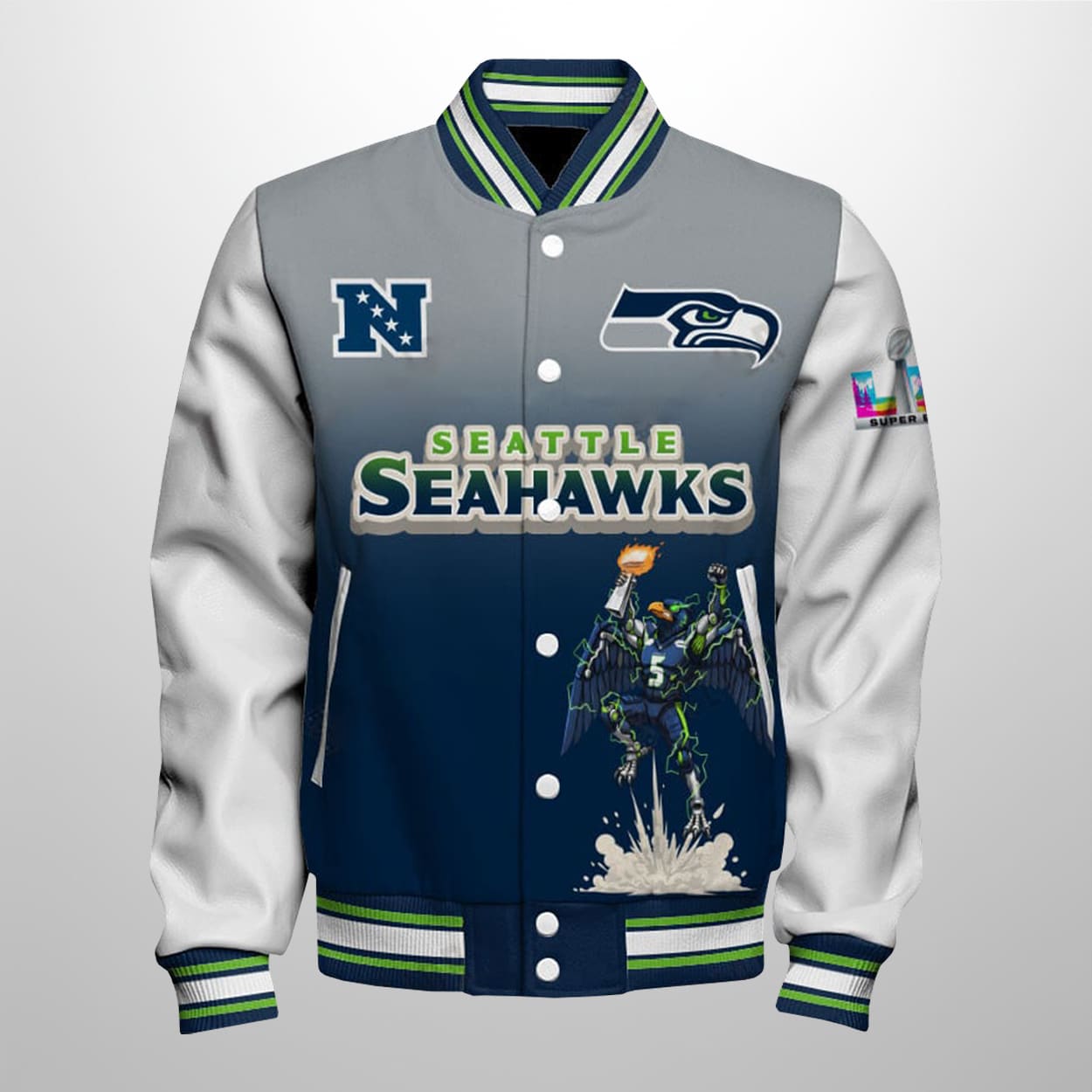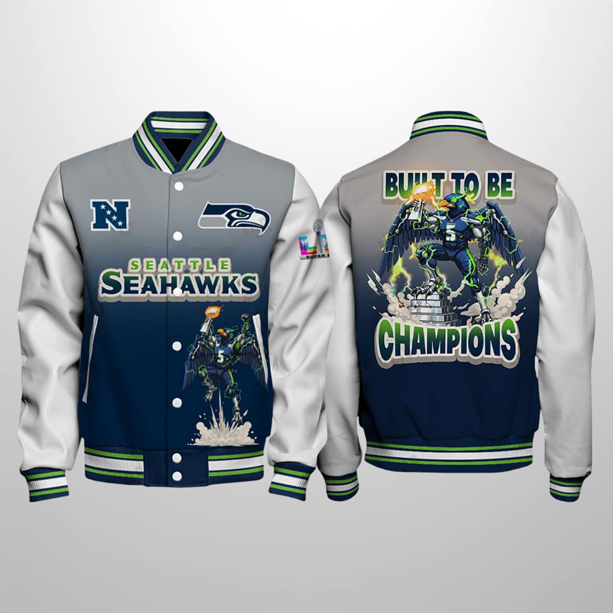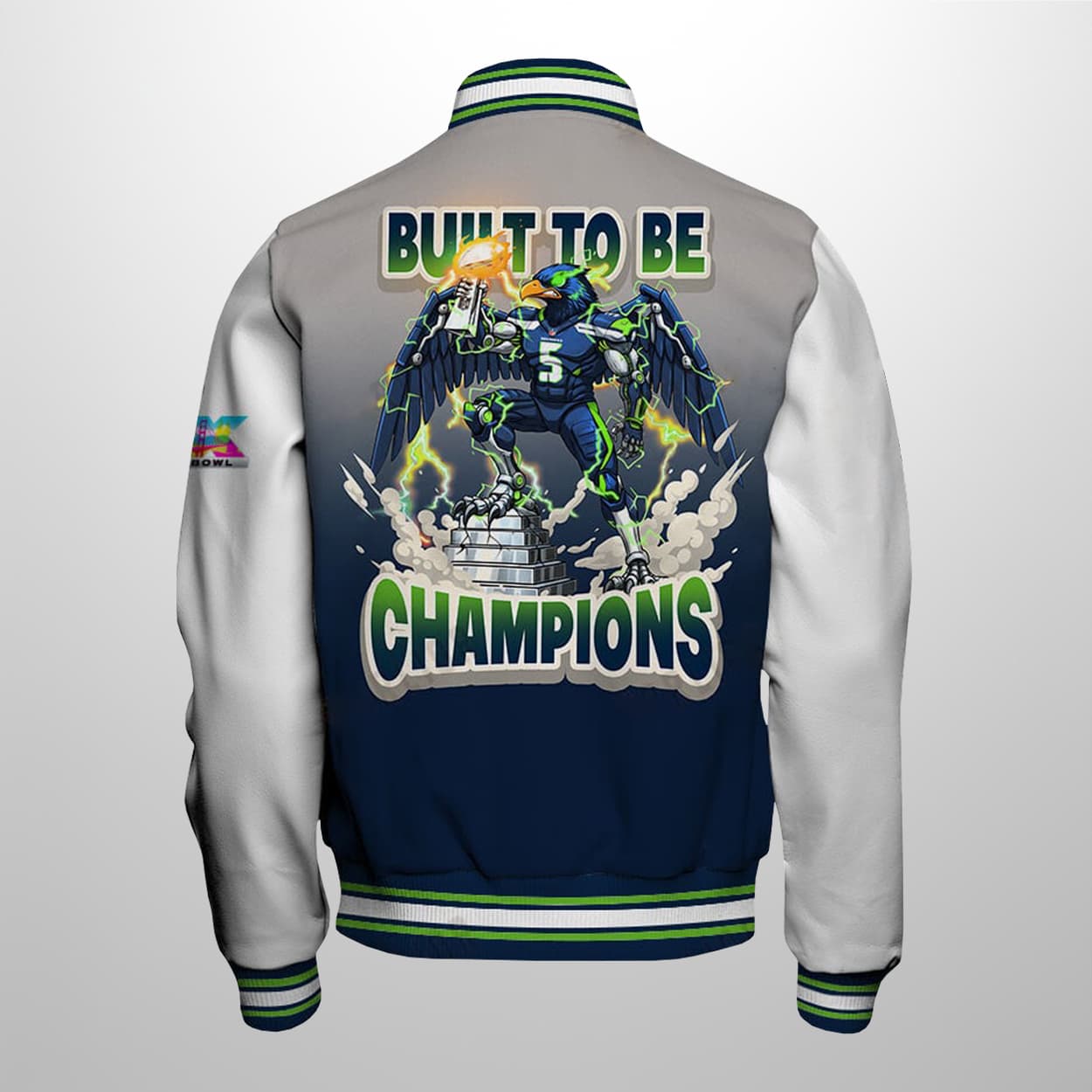 This jacket is a visual masterclass in celebrating Seattle’s 29-13 triumph over the Patriots. This varsity-style piece features a sleek navy-to-gray gradient accented by the iconic NFC “N” and the SB LX on the sleeve. Dominating the rear is a massive graphic of our avian hero standing triumphantly atop a trophy base, surrounded by crackling lightning and the defiant declaration: “BUILT TO BE CHAMPIONS.”