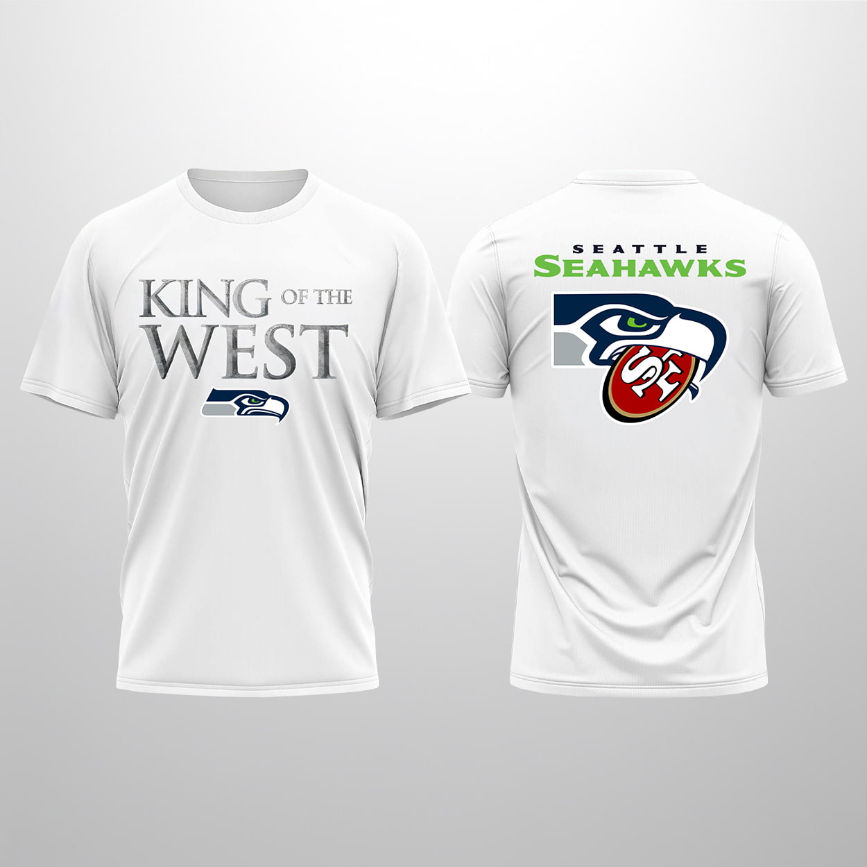 The front of this shirt commands respect with the bold declaration “KING OF THE WEST” rendered in a steely, weathered font that suggests an iron-clad rule, sitting proudly above the sleek Seahawks logo. But the real diplomatic incident happens on the back. Under the vibrant green “SEATTLE SEAHAWKS” banner, the graphic depicts the Seahawk mascot literally devouring the San Francisco 49ers logo. It is a graphic visceral enough to start a trade war, capturing the beak clamping down on the “SF” insignia in a moment of total conquest.