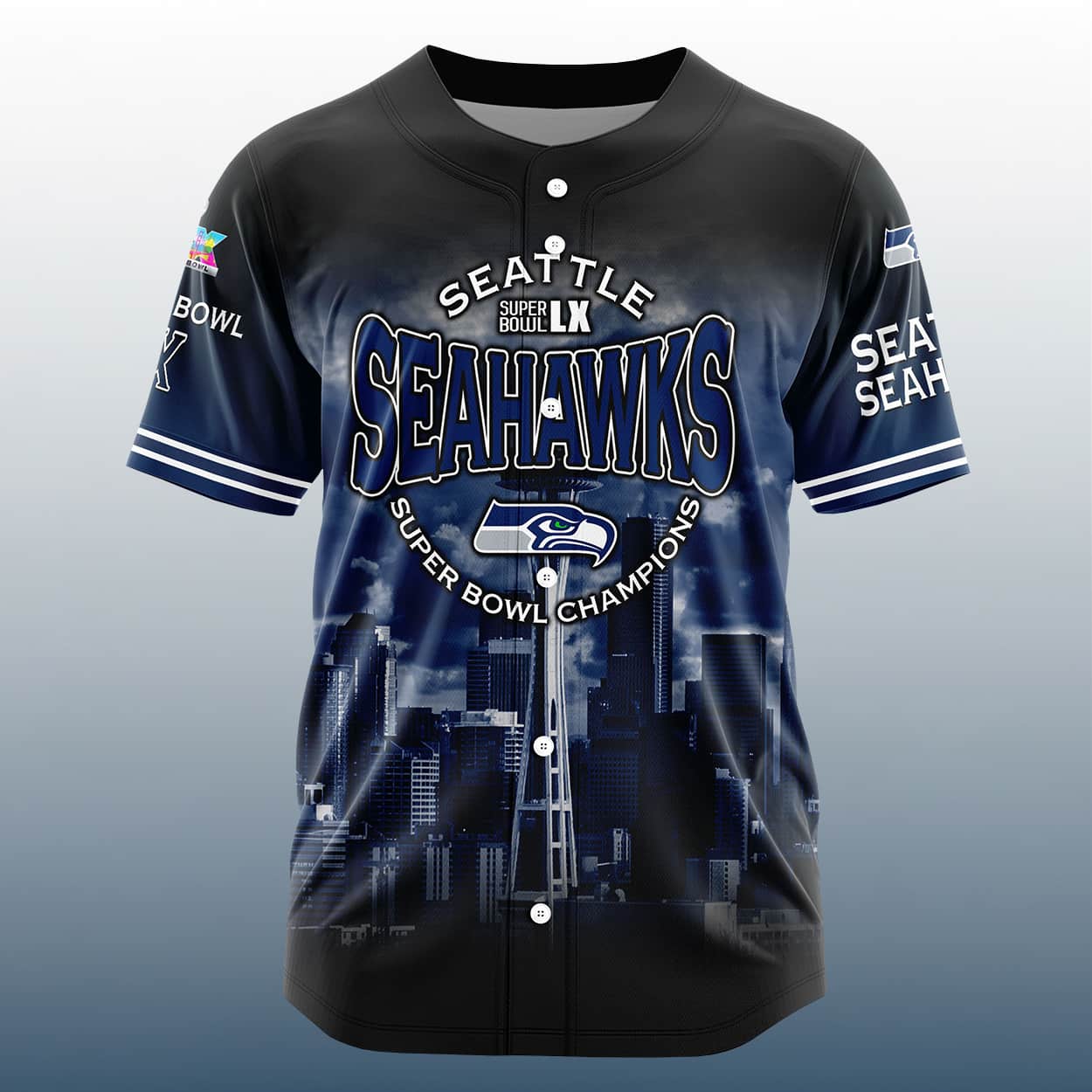 Turn heads and spark conversations with this jersey—a must-have for die-hard fans and collectors alike. The front proudly declares “SEAHAWKS SB LX CHAMPIONS” in bold, battle-ready lettering, flanked by the iconic Seahawks logo and a stylized Seattle skyline that screams hometown pride. Flip it around and you’ll find the SB LX logo centered like a badge of honor, framed by “SEAHAWKS” above and “CHAMPIONS” below—because one angle of greatness just isn’t enough.