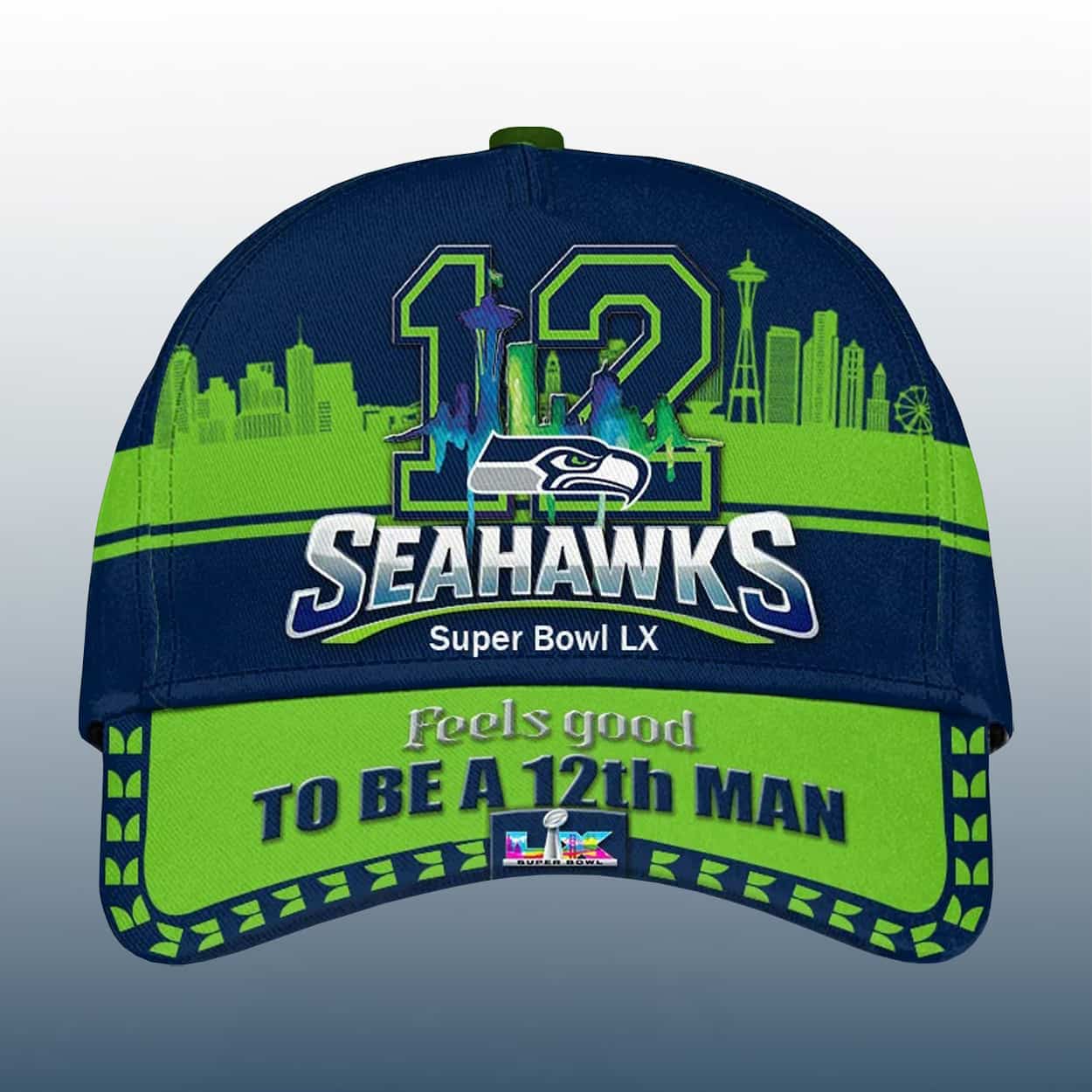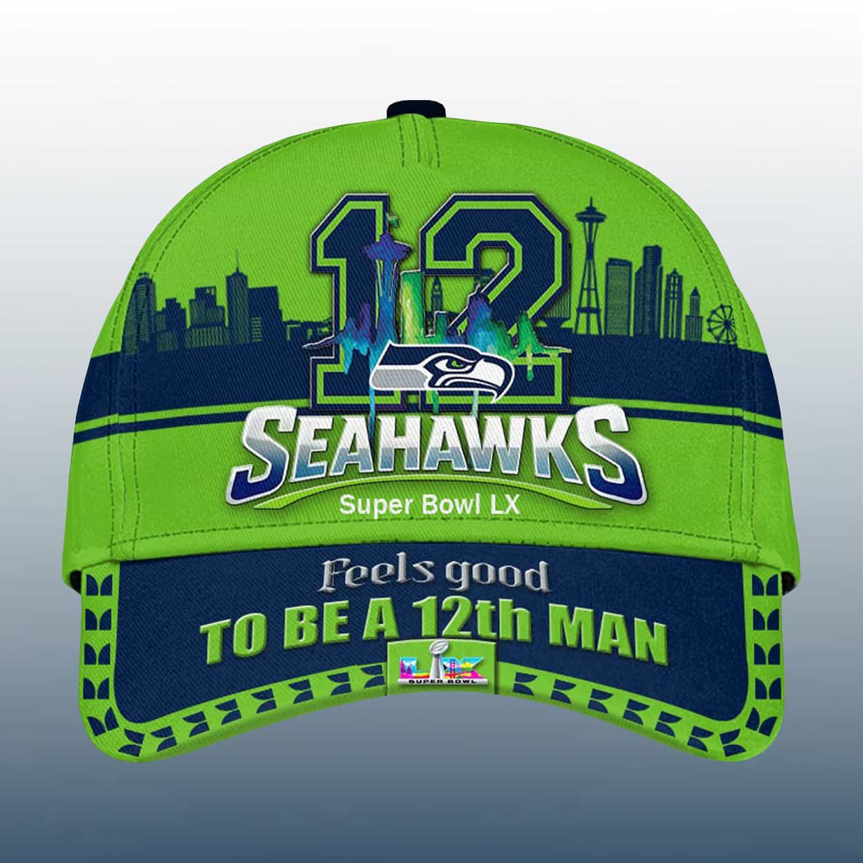 This hat is a bold celebration of fan pride and championship energy. Dominated by the iconic number “12” in vibrant blue and green, the design pays homage to the legendary 12th Man—the heartbeat of Seattle football. Behind the number, a green silhouette of the Seattle skyline rises, featuring the unmistakable Space Needle and cityscape. Just below, “SEAHAWKS” is emblazoned in crisp white with the team’s logo perched above, while “SB LX” anchors the design with championship flair. The brim seals the deal with the phrase “Feels good TO BE A 12th MAN” in a playful mix of green and white.