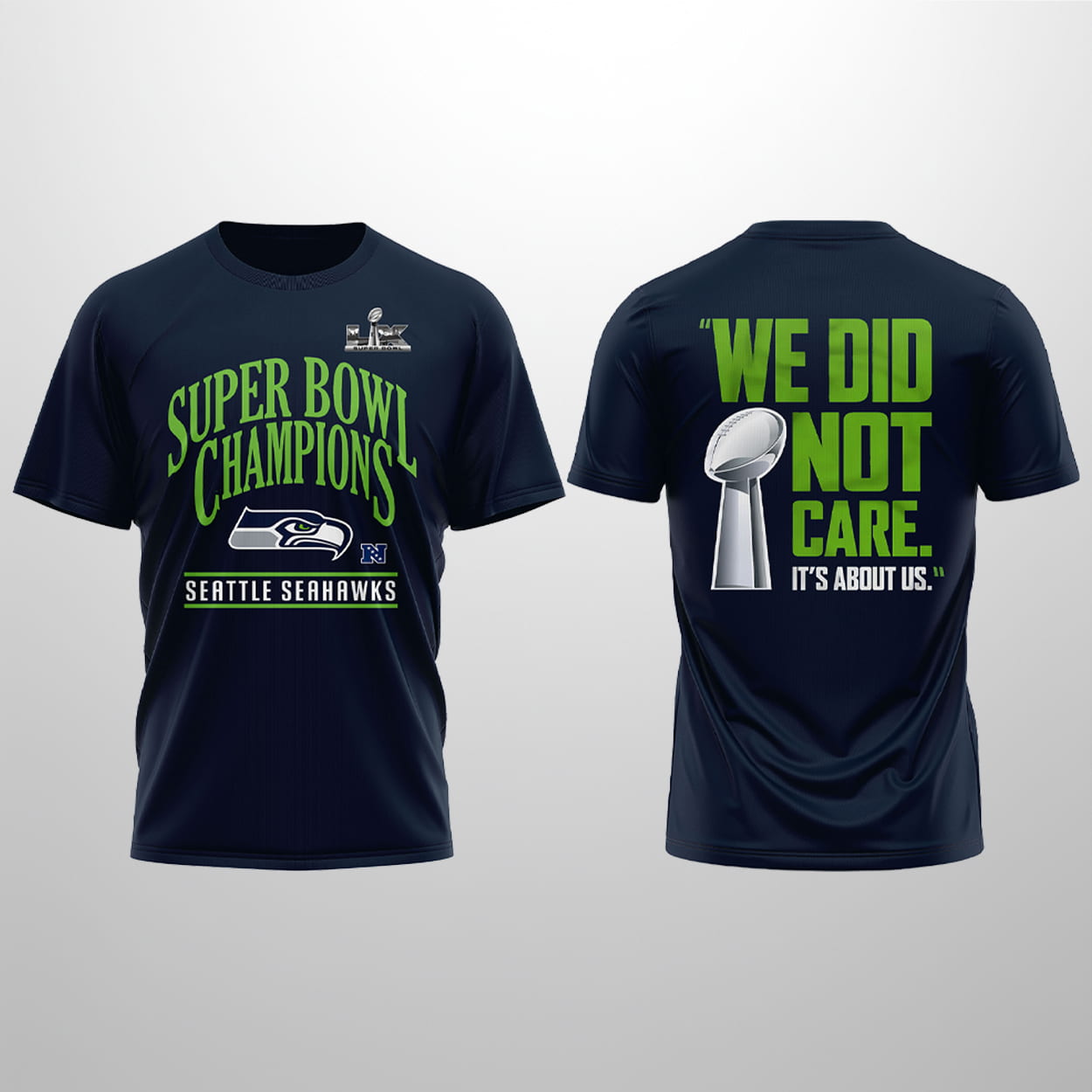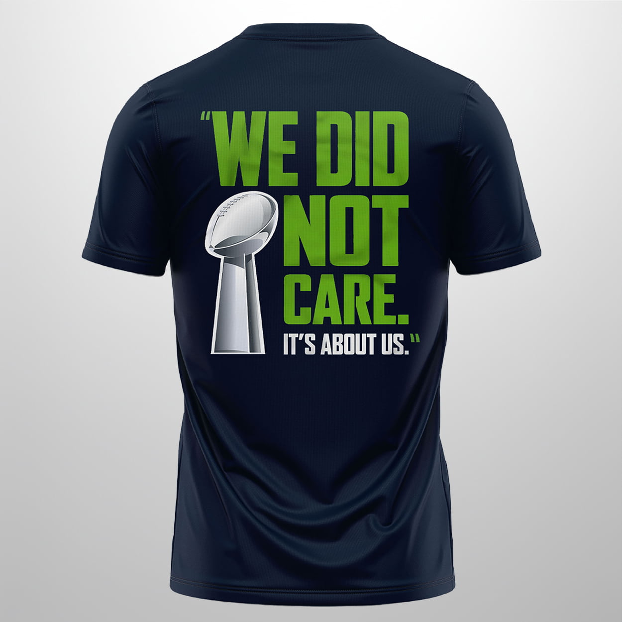 The back of the shirt immortalizes the mindset that defined the 2026 season. Featuring a massive Lombardi Trophy, it bears the defiant mantra: “WE DID NOT CARE. IT’S ABOUT US.” This viral quote from Coach Mike Macdonald perfectly encapsulates the team’s journey from preseason longshots to world champions. It’s a nod to the locker room’s internal bond and their refusal to let outside noise or past heartbreak—like that 2015 rematch narrative—distract them from the mission.
