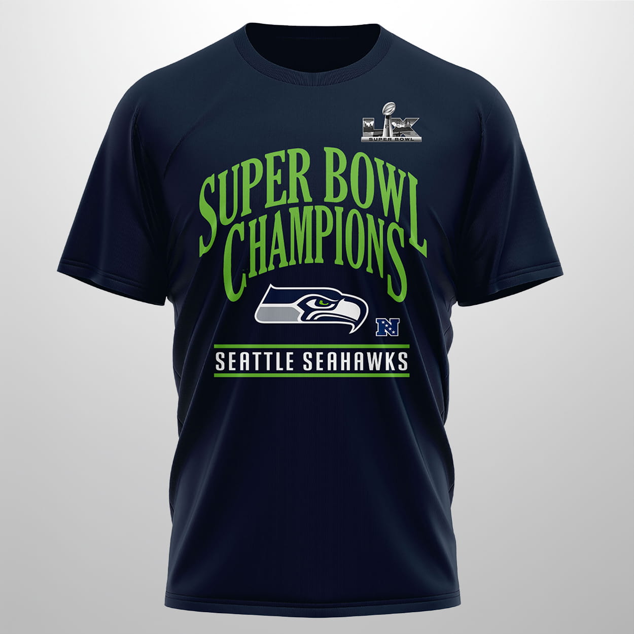 This commemorative shirt is the ultimate badge of honor for the 12th Man following Seattle’s historic defensive masterclass against the New England Patriots. The front features a bold “Super Bowl Champions” arc in vibrant Action Green, anchored by the iconic Seahawks logo and the Super Bowl LX insignia. Set against a deep navy backdrop, the design captures the energy of the night the Lombardi Trophy officially returned to the Pacific Northwest.