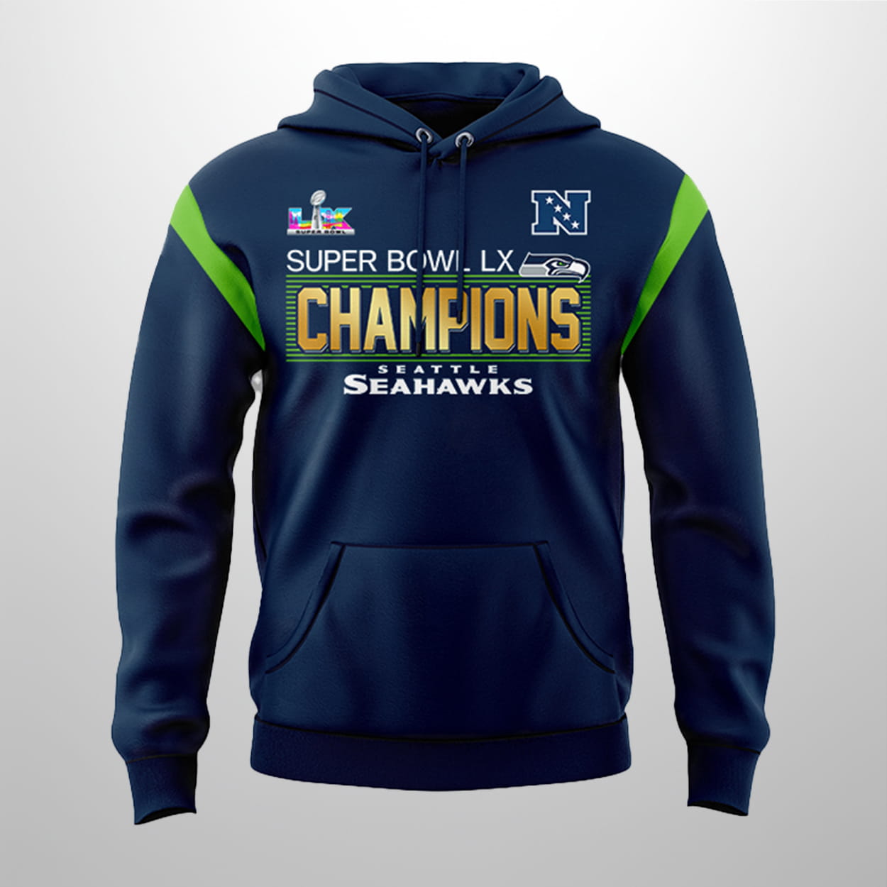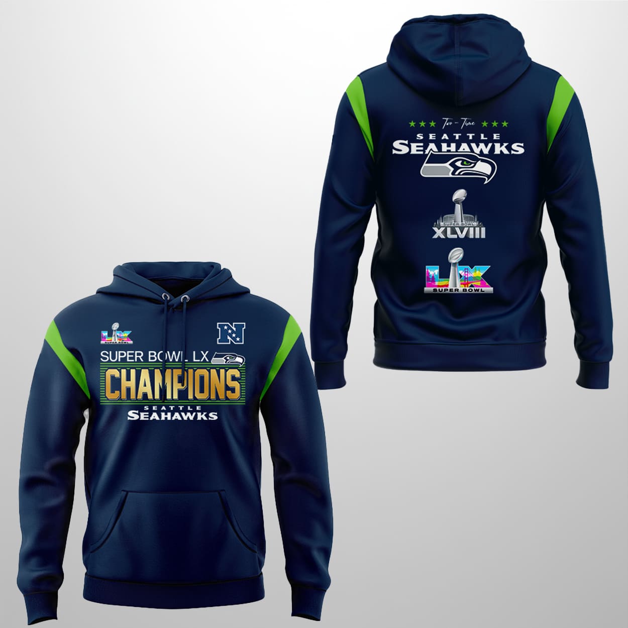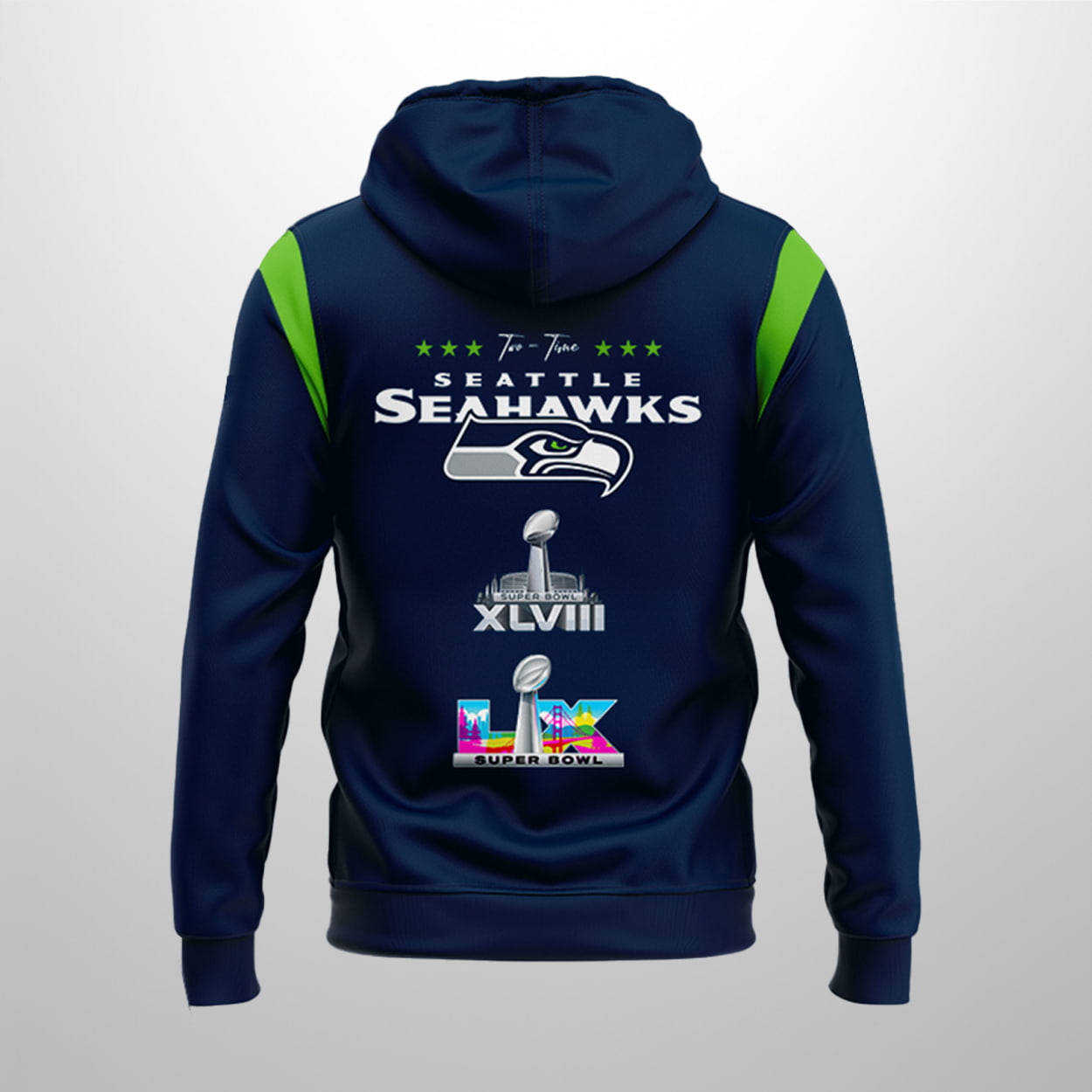 This design looks back at where the legacy started while celebrating where it stands today. The back of the hoodie features a “Two-Time” tribute, elegantly lining up the classic SB XLVIII trophy alongside the brand-new SB LX hardware. It’s a playful nod to the fans who knew that a rematch with the Patriots would end in Emerald City glory this time around. The sharp green accents on the shoulders add a bolt of energy, mirroring the “Dark Side” defense that shut down the field. It’s built for those who think big, cheer loud, and want to carry a piece of 2026 history wherever they go.