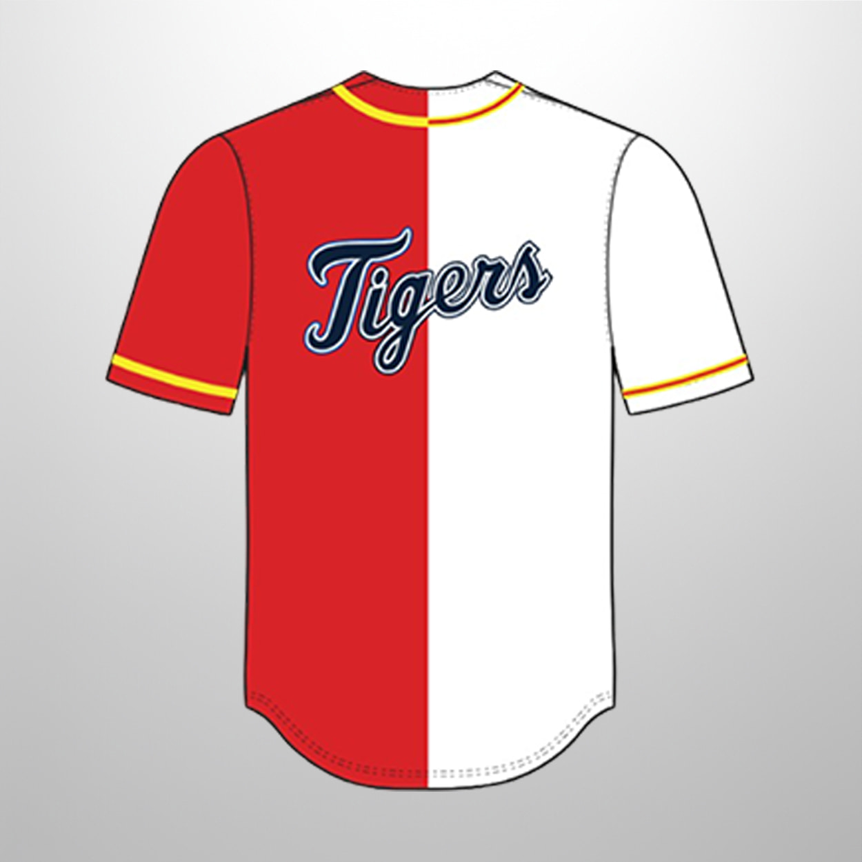 This jersey is a dazzling tribute to heritage and hustle. This split-panel stunner features a white left front adorned with a repeating Macedonian flag pattern, while the right side blazes in solid red with a crisp white “D” emblem that nods to Detroit’s iconic identity. Yellow accents on the collar and cuffs add a pop of brightness, tying the look together with flair. On the back, the color scheme flips—red on the left, white on the right—with “Tigers” scrawled across the shoulders in bold cursive, making this jersey a true showstopper from every angle.