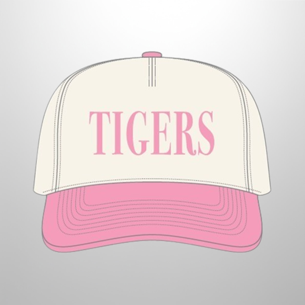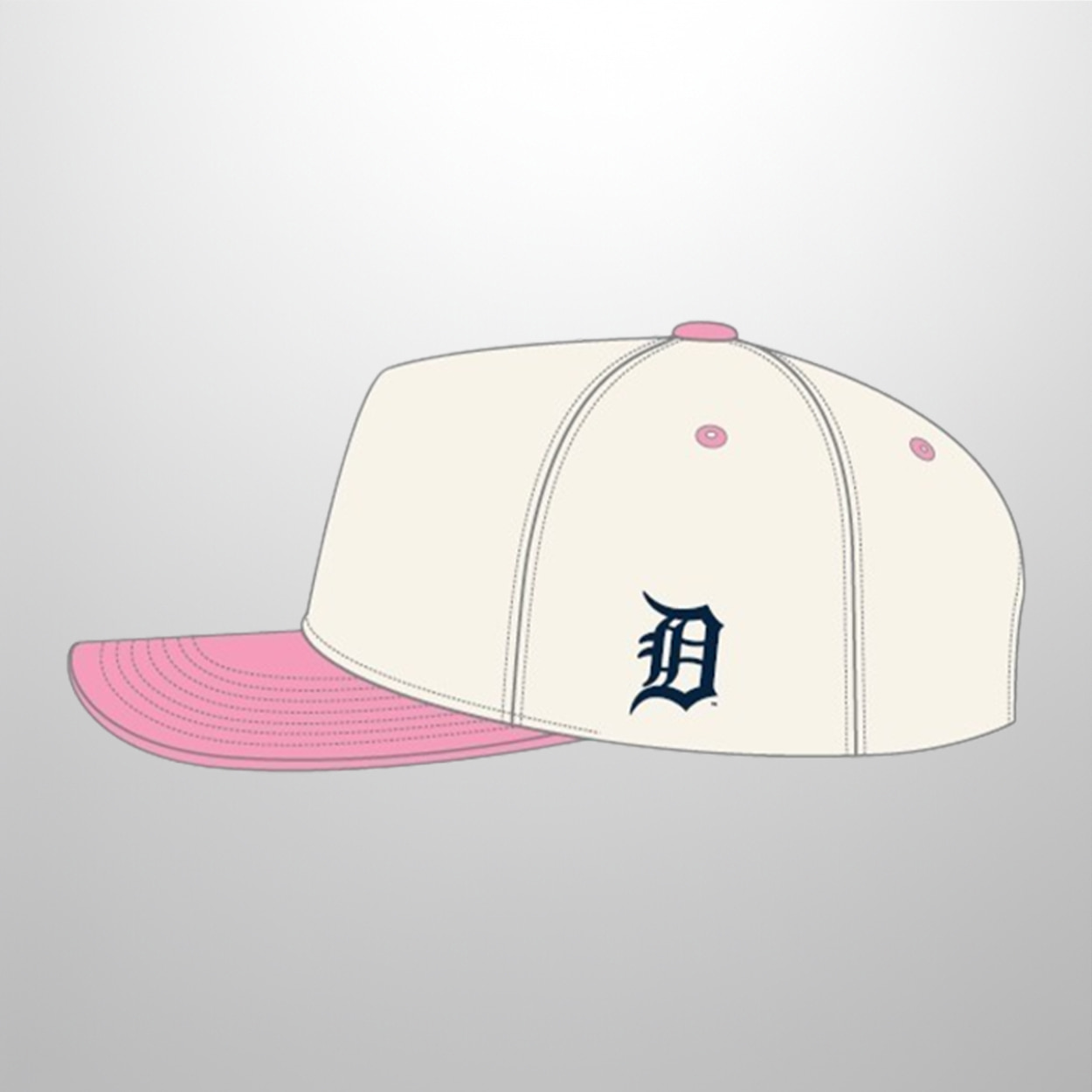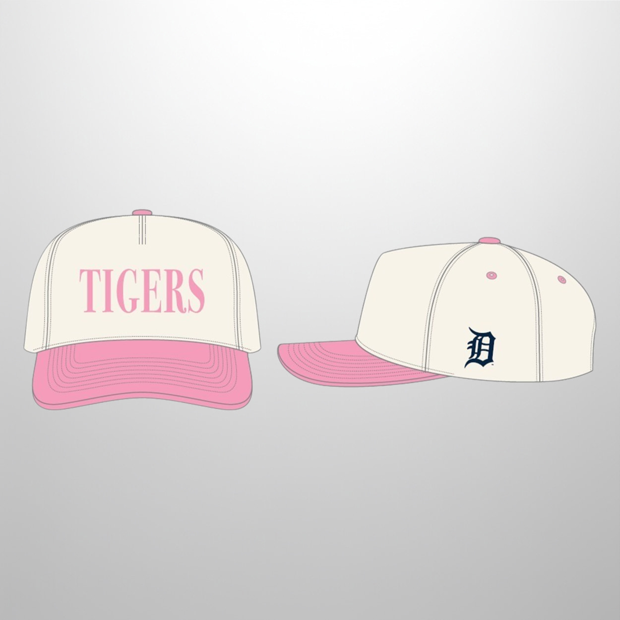 This cap is a fresh take on classic team spirit. With a crisp white crown, a lively pink brim, and a matching pink top button, this cap instantly catches the eye. Across the front, the word “TIGERS” pops in bold pink lettering, while the side panel proudly displays a navy blue “D”, a nod to Detroit’s iconic symbol. It’s playful, stylish, and unmistakably Tigers.