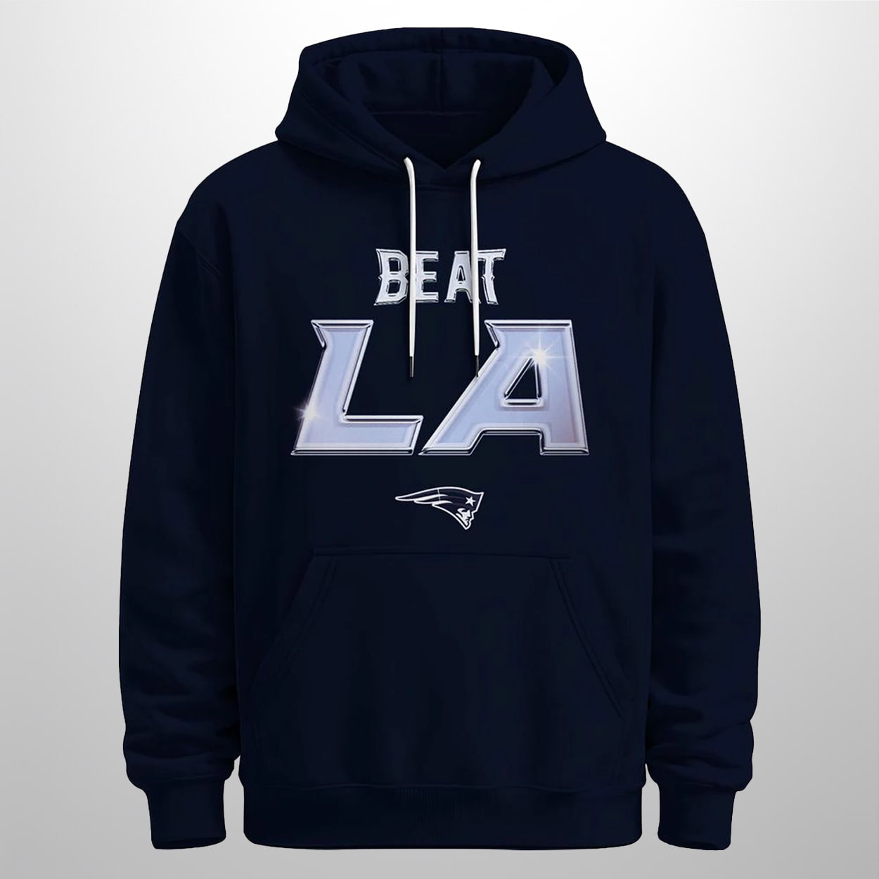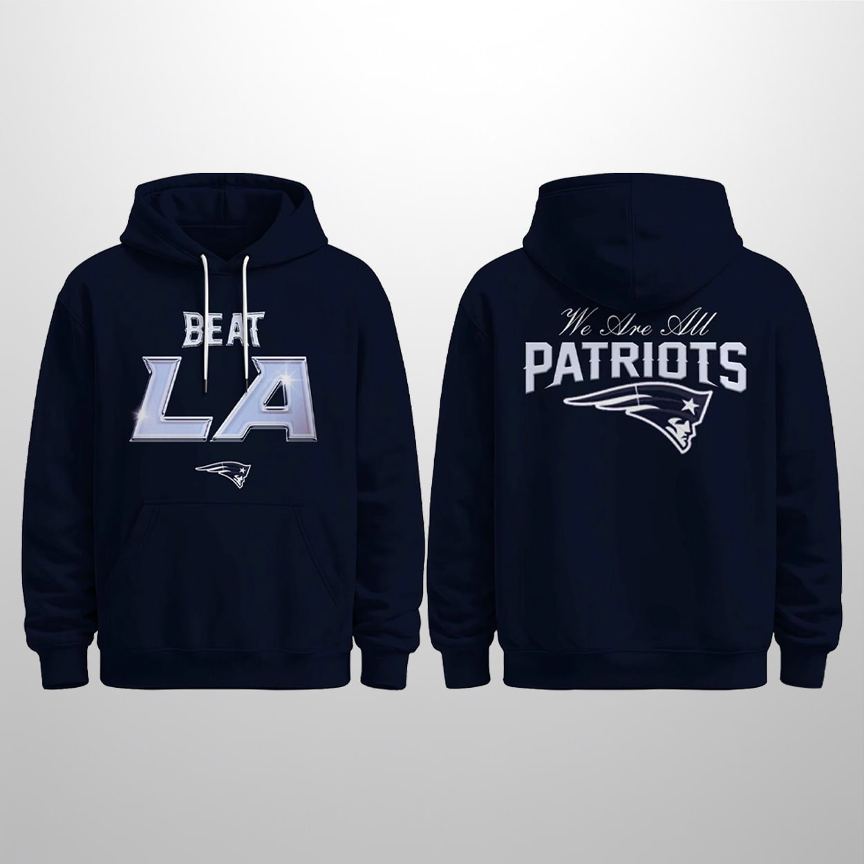 This hoodie is your ultimate fan armor—designed to turn heads and stir up some friendly fire. On the front, “BEAT LA” blazes in bold, metallic-style lettering, daring and defiant, with the unmistakable Patriots logo anchoring the message. Spin it around and you’ll find “We Are All PATRIOTS” stamped across the back, with “PATRIOTS” in commanding block letters and another proud logo below. It’s a full-circle tribute to team loyalty and competitive spirit.