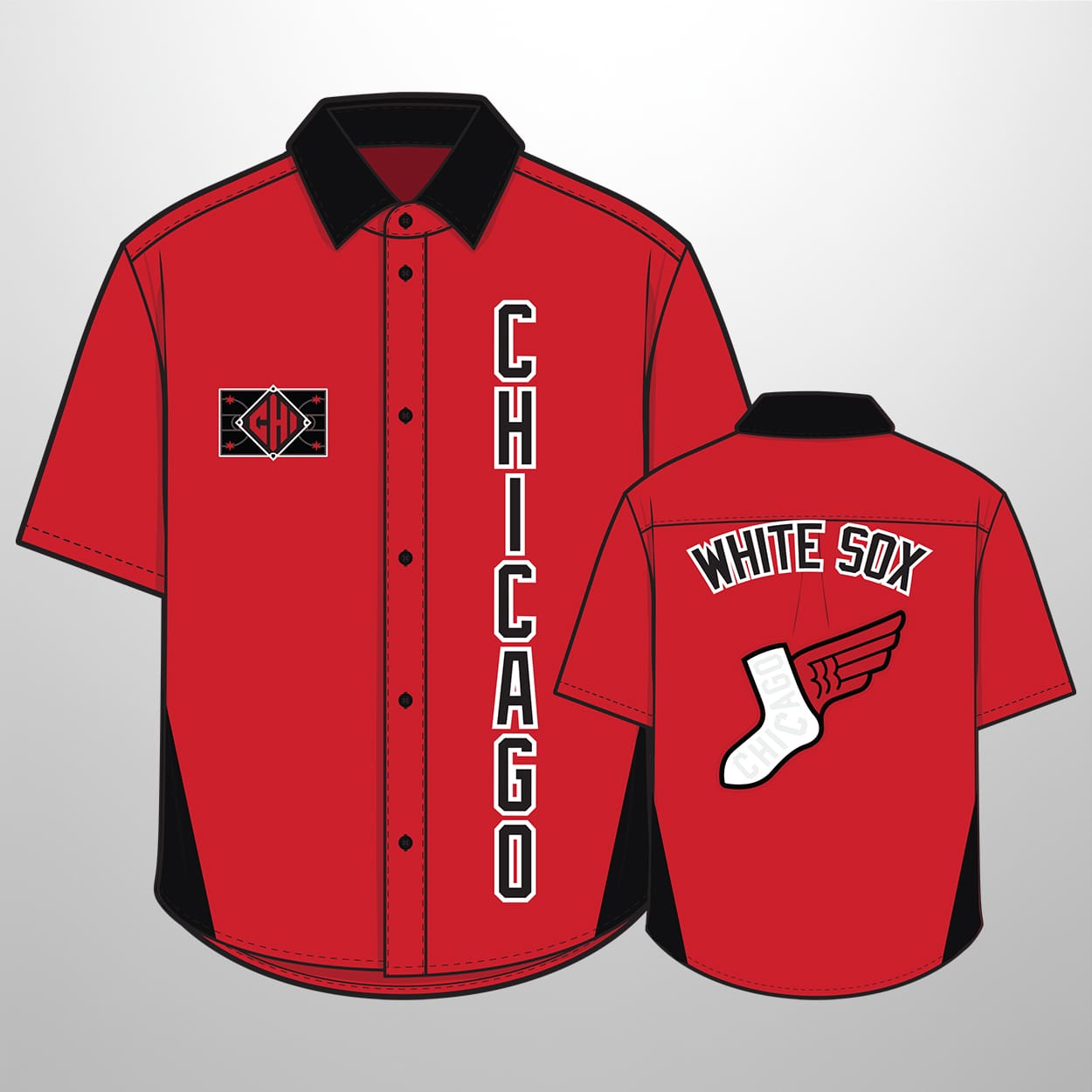 This Hawaiian-style warmup shirt is more than just fan gear—it’s a statement piece. The front features “CHICAGO” written vertically in bold white letters outlined in black, running down the right side for a striking visual effect. On the left chest, a patch with the stylized “CHI” logo pops in red and black, adding a sharp detail that ties the look together. Flip it around, and the back proudly displays “WHITE SOX” in bold white letters with black outlines, sitting above a dynamic graphic of a winged white sock—a playful twist on the team’s iconic symbol.