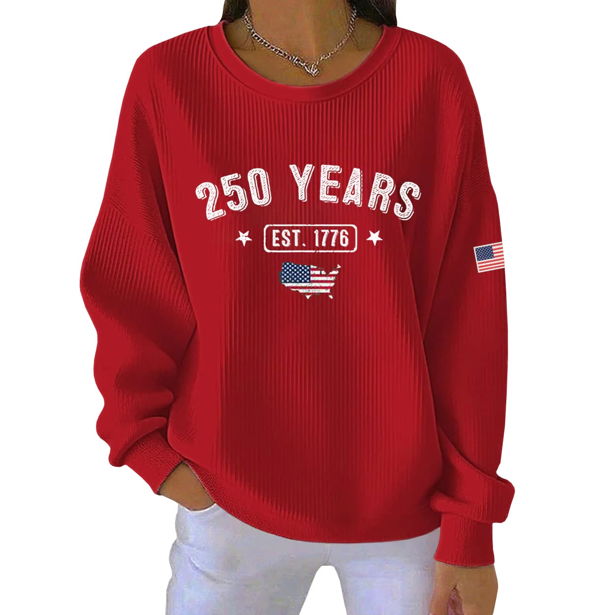 Make history your fashion statement with this sweatshirt. This vibrant red piece packs a punch of patriotic pride, featuring “250 YEARS” in bold white lettering across the chest, with “EST. 1776” flanked by two stars just below. The centerpiece? A graphic of the continental United States filled with the American flag—stars and stripes waving across the map like a celebration in motion. A subtle American flag patch on the left sleeve adds a finishing touch that says, “Yes, I’m proud to be here.”