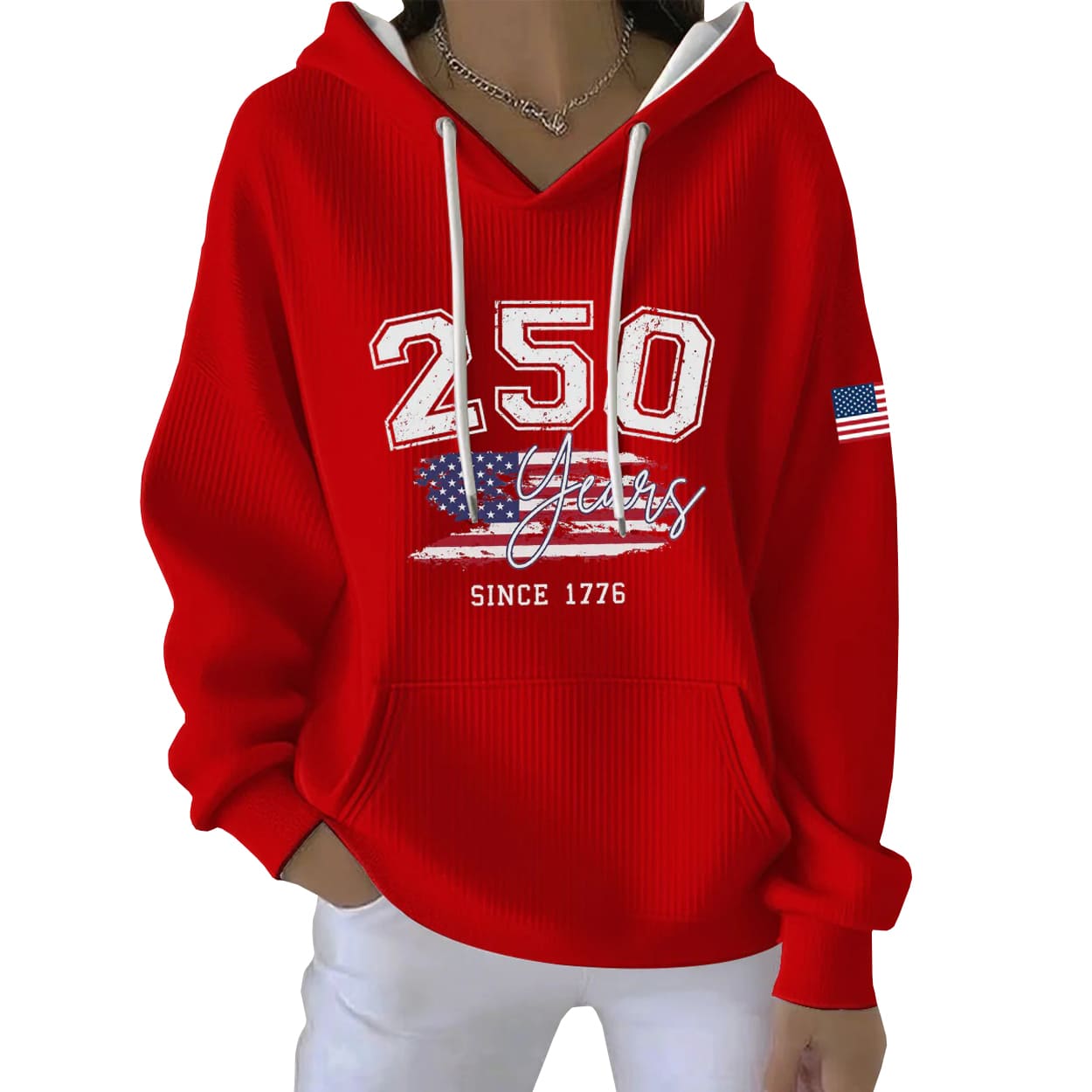 This hoodie doesn’t just warm you up—it fires you up. With a vivid red base and crisp white drawstrings, it features a bold “250” front and center, flanked by a stylized American flag and the elegant script “Years.” Just below, the phrase “SINCE 1776” anchors the design with historical weight. A small flag patch on the sleeve. It’s a wearable celebration of 250 years of American spirit, designed to stand out whether you’re at a barbecue or a block party.