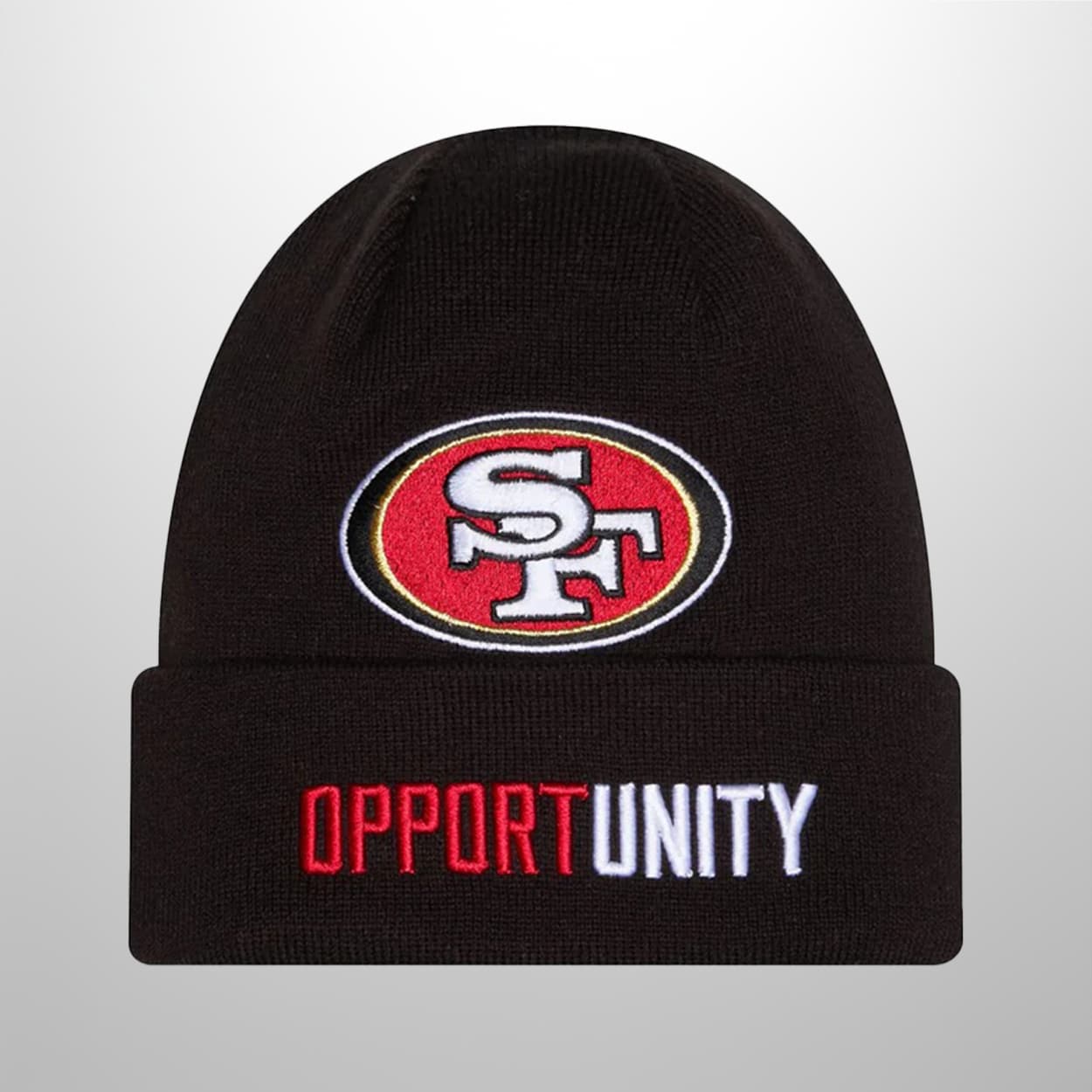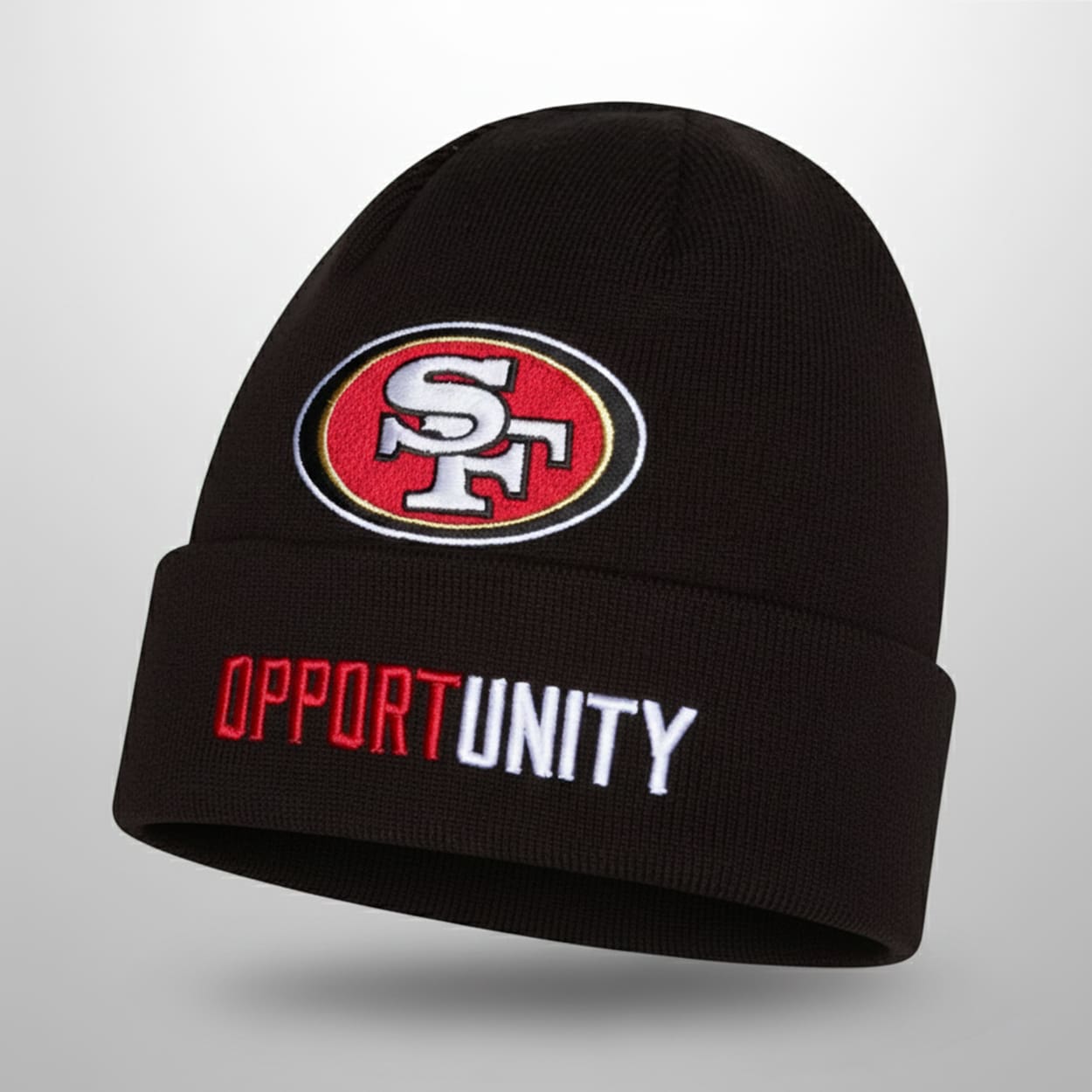 Step into the season with swagger and substance in this hat. This sleek black knit beanie is more than just a cozy head-turner—it’s a wearable shoutout to your team and your values. Front and center, the iconic 49ers logo pops in classic red, white, and black embroidery, letting everyone know where your loyalty lies. But the real twist? The word “OPPORTUNITY” stitched across the brim, with “OPPORT” in bold red and “UNITY” in crisp white. It’s not just a word—it’s a vibe.
