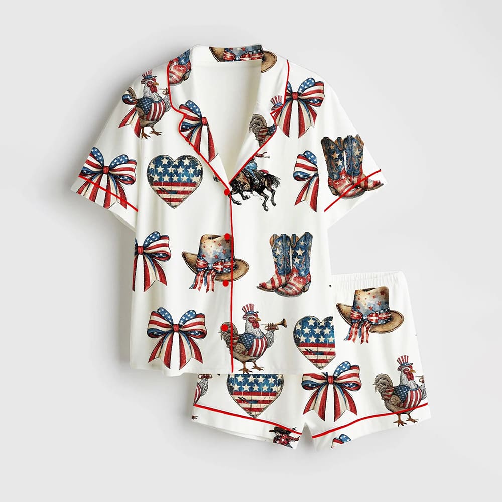 Get ready to make a star-spangled statement with the 4th Of July Coquette Bow Western Satin Pajama Set! The set is adorned with a whimsical print featuring iconic American symbols: proud roosters, cowboy boots, hats, and a galloping horse, all tied together with red, white, and blue coquette bows and heart-shaped American flags. The shirt boasts a notched collar with red piping for a polished touch, while the shorts feature an elastic waistband for ultimate comfort. Whether you’re hosting a patriotic sleepover or simply lounging at home, this pajama set combines festive spirit with a flirty, Western-inspired twist.