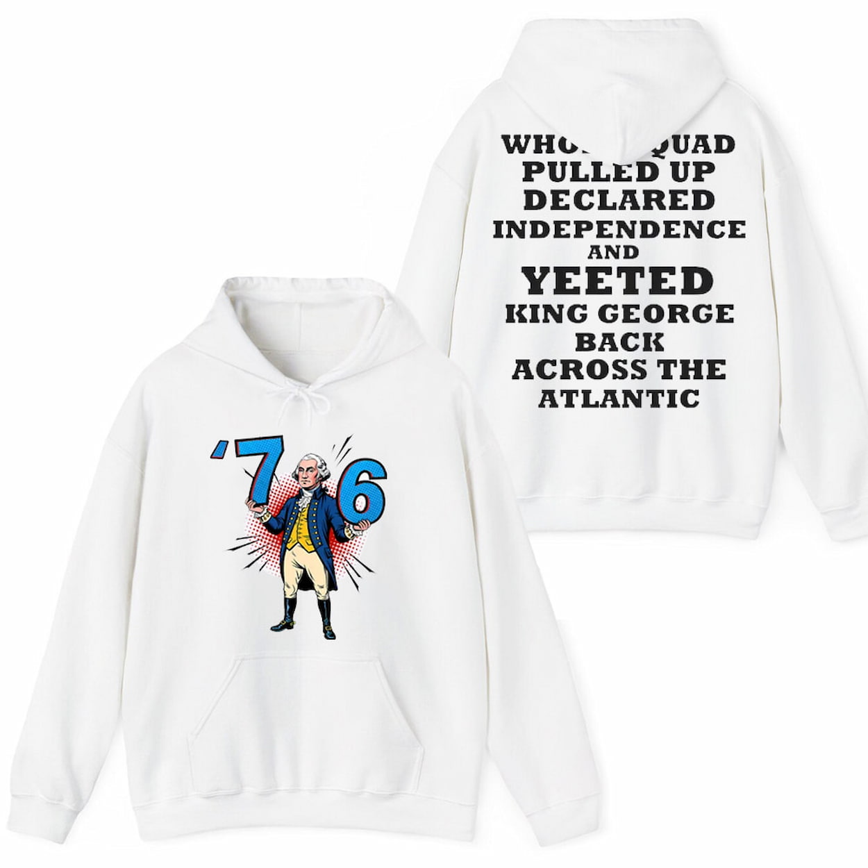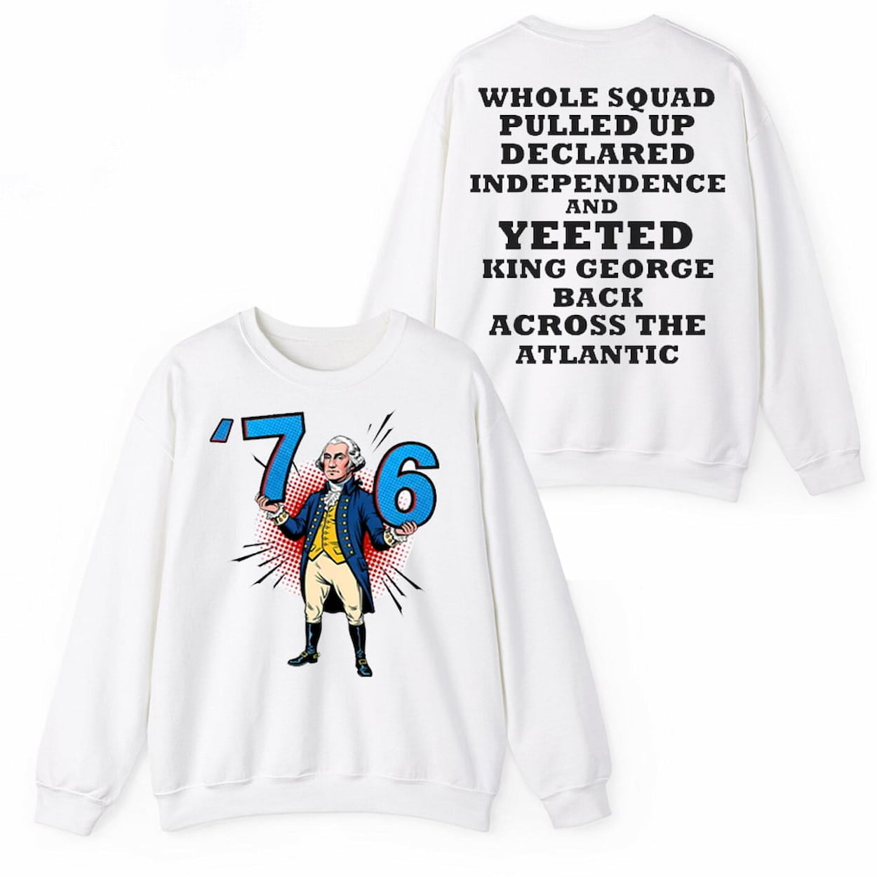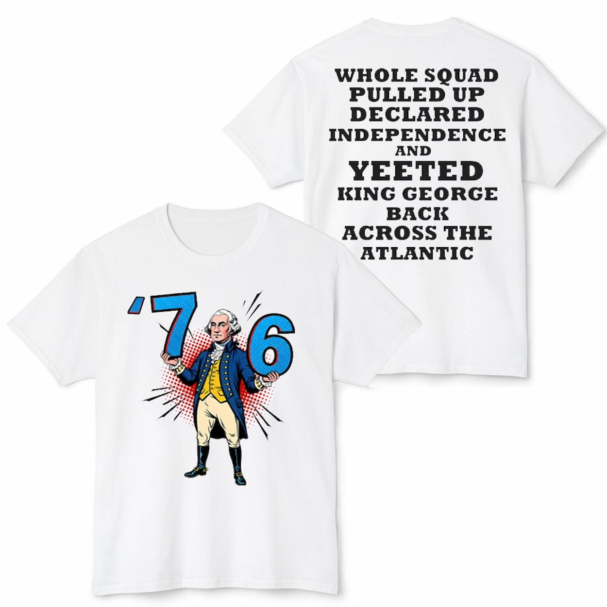 This shirt is a whole vibe. On the front, a cartoon-style George Washington throws up giant blue numbers “7” and “6” like he’s calling out the year that changed everything—1776. Behind him, red and blue comic-style bursts add a punch of patriotic energy. Flip it around and the back delivers the knockout line: “WHOLE SQUAD PULLED UP DECLARED INDEPENDENCE AND YEETED KING GEORGE BACK ACROSS THE ATLANTIC.” It’s bold, it’s cheeky, and it’s guaranteed to get laughs while dropping some revolutionary knowledge.