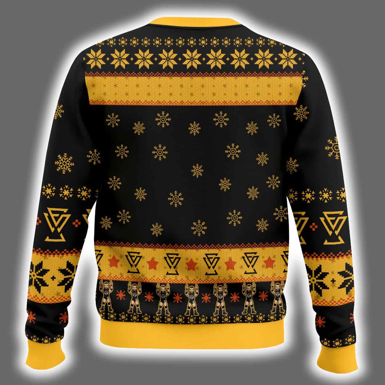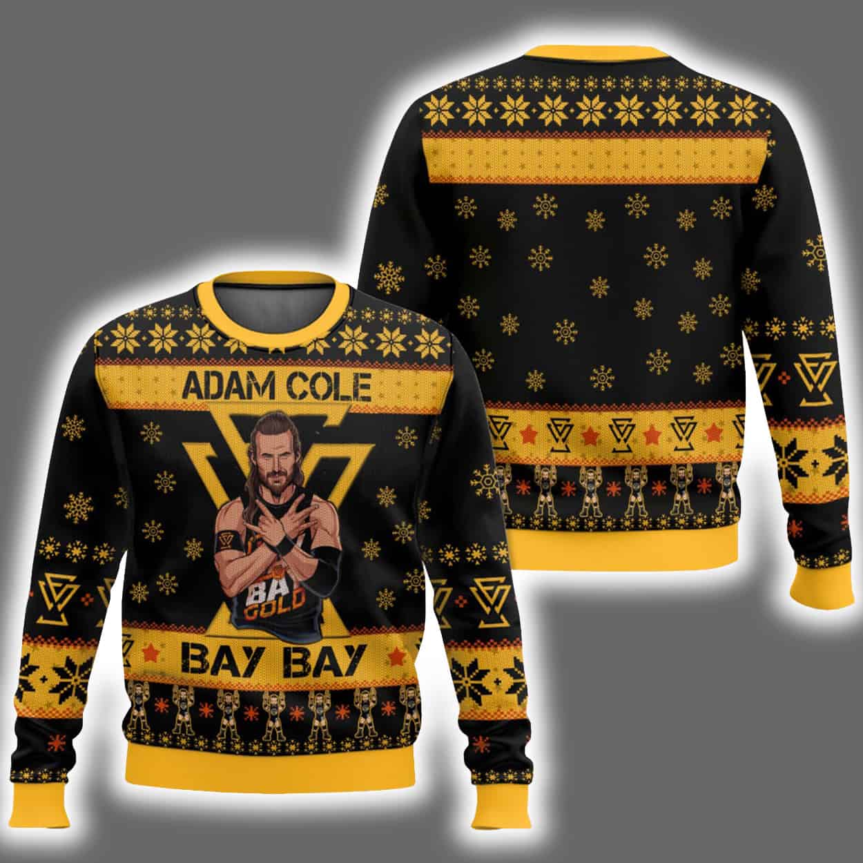 Step into the ring of holiday fashion with this sweater—a knockout blend of festive fun and wrestling fandom. The front showcases a dynamic image of Adam Cole mid-pose, flanked by bold text: “ADAM COLE” above and his iconic catchphrase “BAY BAY” below. The black and yellow palette pops against a backdrop of snowflakes, trees, and geometric patterns, while the back continues the celebration with Cole’s logo and matching motifs.
