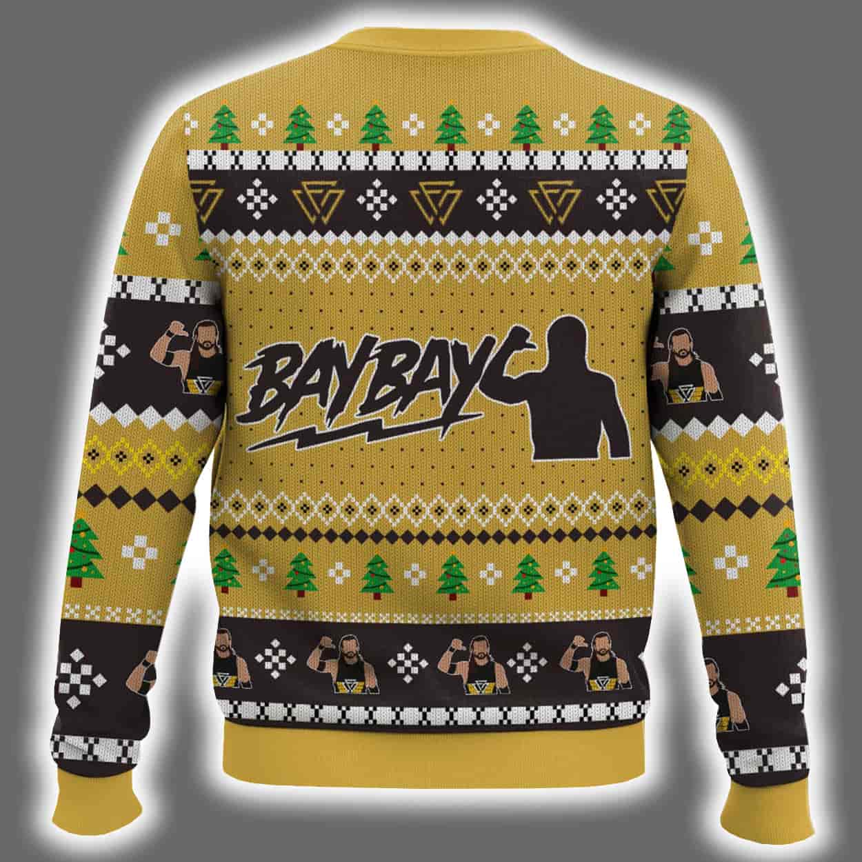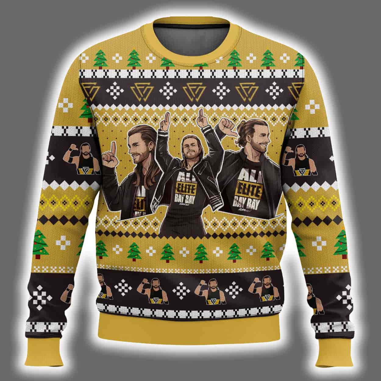 Step into the ring of holiday fashion with this sweater, a knockout blend of festive fun and wrestling swagger. Featuring a bold palette of yellow, black, white, and green, this sweater is decked out with classic holiday motifs—snowflakes, trees, and geometric patterns—wrapped around a trio of triumphant wrestlers striking their iconic poses. Front and center, the phrase “ALL ELITE BAY BAY” shouts out to fans of All Elite Wrestling and the charismatic Adam Cole. Flip it around and you’ll find “BAY BAY” emblazoned across the back, flanked by diamond-shaped logos and a silhouette that screams main-event energy.