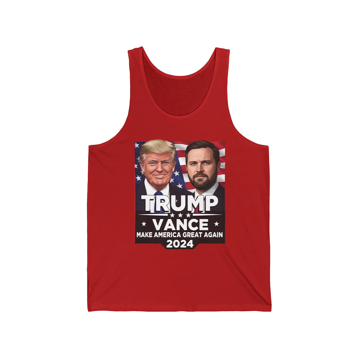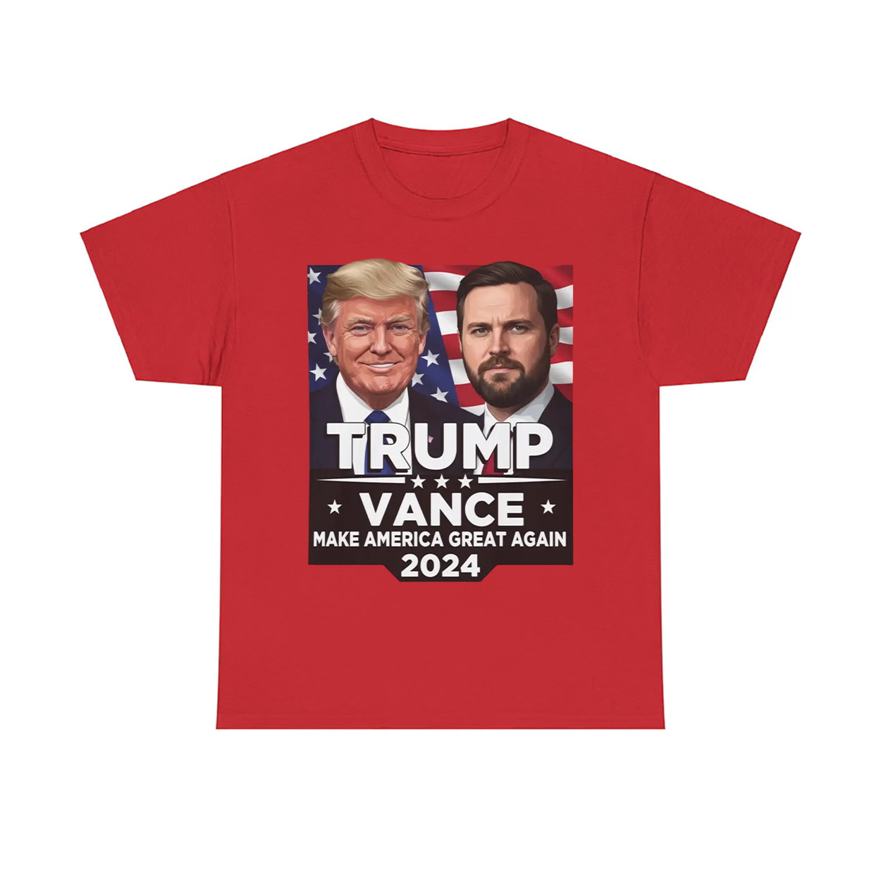 This shirt is more than just apparel—it’s a billboard of bold beliefs. Front and center are striking portraits of Donald Trump and J.D. Vance, set against a waving American flag backdrop that screams stars, stripes, and unapologetic pride. Beneath the duo, the slogan reads: “TRUMP VANCE MAKE AMERICA GREAT AGAIN 2024,” stacked in crisp white and red lettering that pops with purpose. Whether you’re rally-bound or just grabbing coffee, this shirt makes sure your stance is seen and heard.