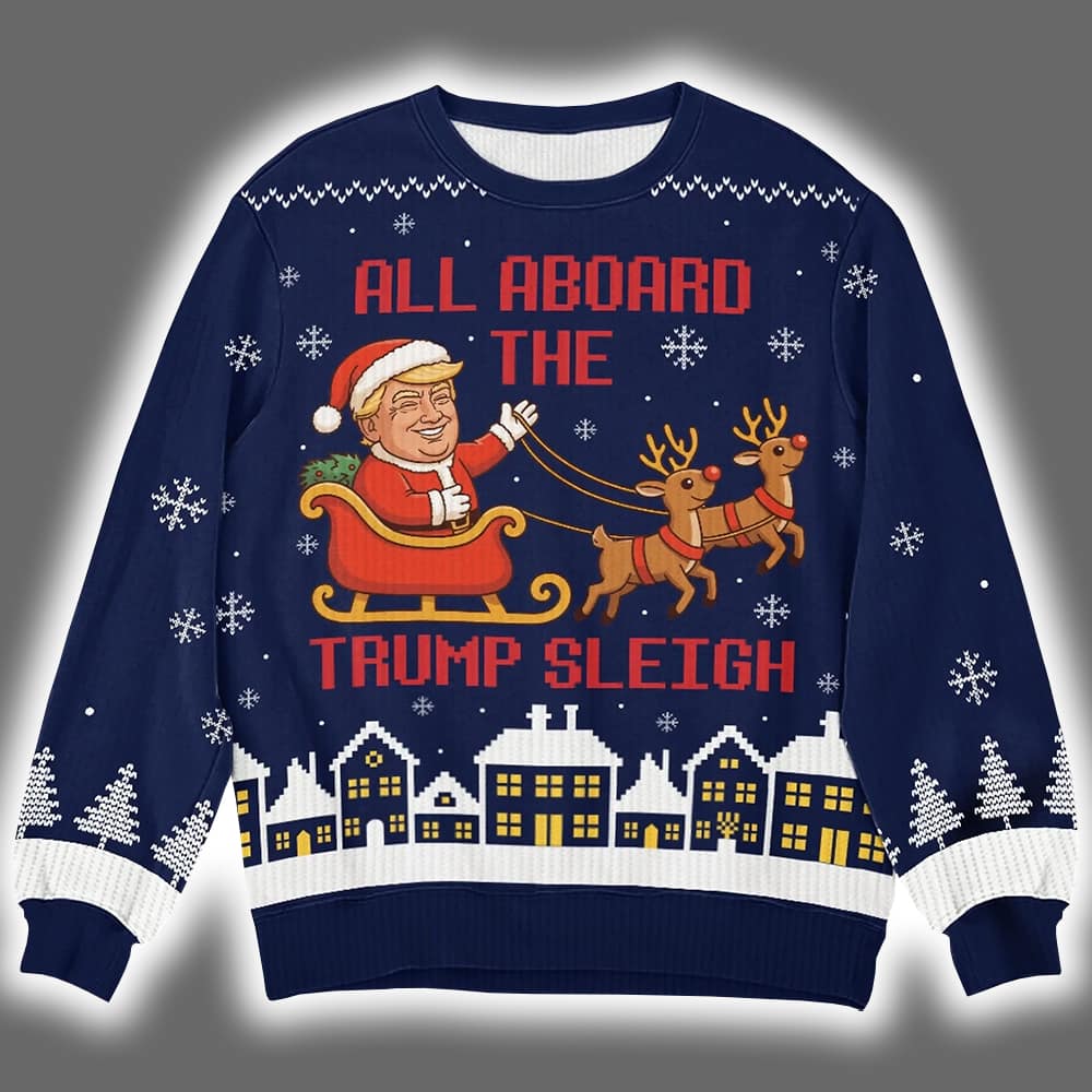 Make spirits bright and conversations lively with the All Aboard The Trump Sleigh Ugly Christmas Sweater—a cheeky holiday classic that blends festive charm with political satire.