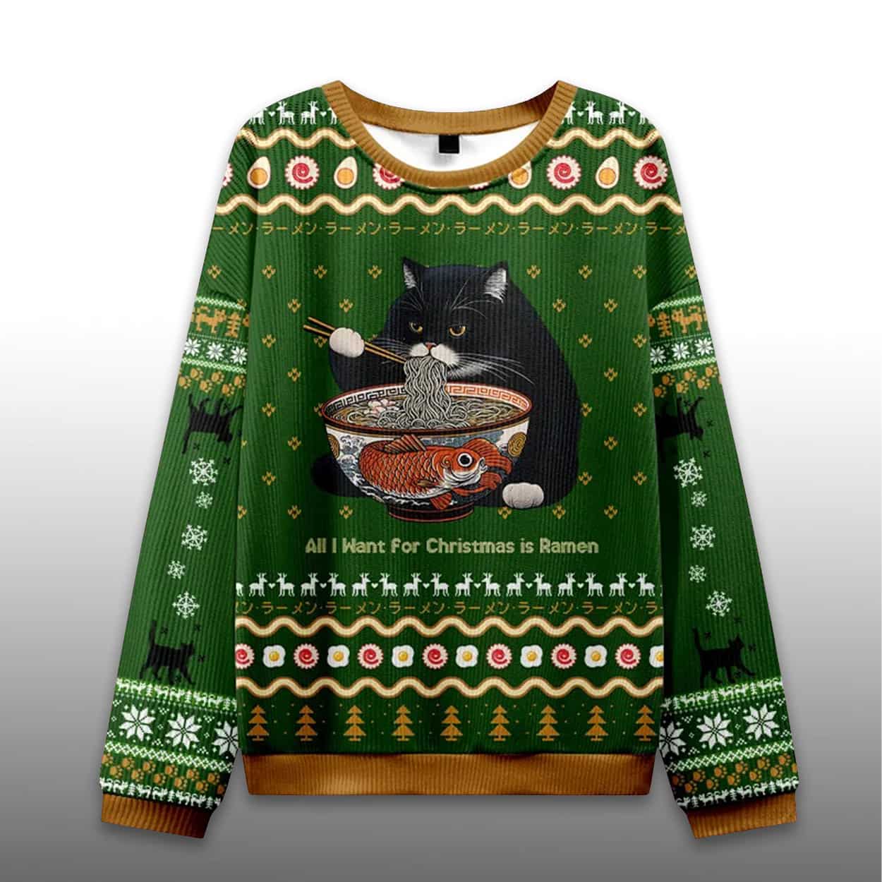 This sweater is a brilliant and unique mashup of three different worlds: the cozy “Ugly Christmas Sweater” tradition, the love of Japanese culture (ramen and art), and the internet’s obsession with “chonky” cat memes. The “All I Want for Christmas is Ramen” slogan makes it the ultimate holiday apparel for the dedicated cat lover, the foodie, the ramen enthusiast, or anyone with a quirky sense of humor who wants a truly unique piece that stands out.